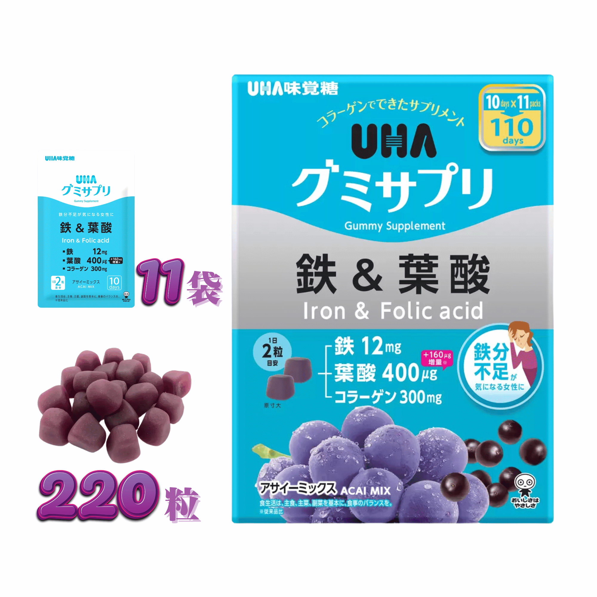 UHA味覚糖 グミサプリ 鉄 & 葉酸 220粒 110日分 アサイーミックス コラーゲン配合 鉄分 サプリメント