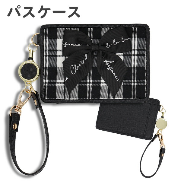 パスケース 定期入れ リール付き チェック×リボン(C05408-ブラック) ストラップ付き かわいい おしゃれ 女の子 高校生 中学生 小学生 子供 キッズ レディース