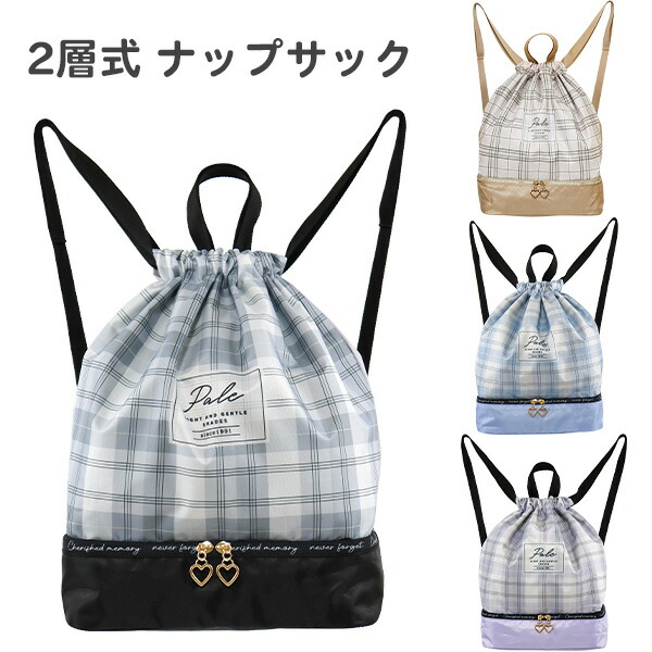 ナップサック 2層式 女の子 チェック柄 (C23050) プールバッグ 体操着入れ 体操服入れ 巾着 キッズ 子供 小学生 おしゃれ かわいい ナップザック
