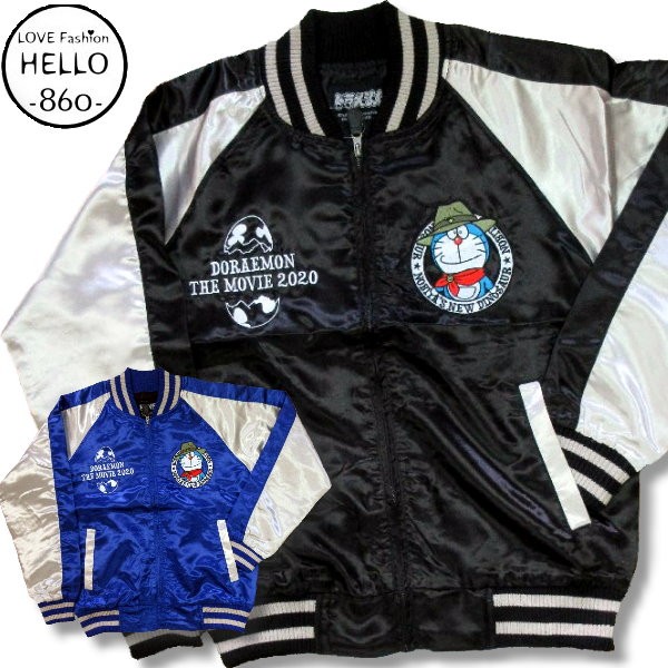 ドラえもん メンズ 綿抜き スカジャン 刺繍 ワッペン 小物 柄 サテン アメカジ 黒 青 再入荷 / bia501