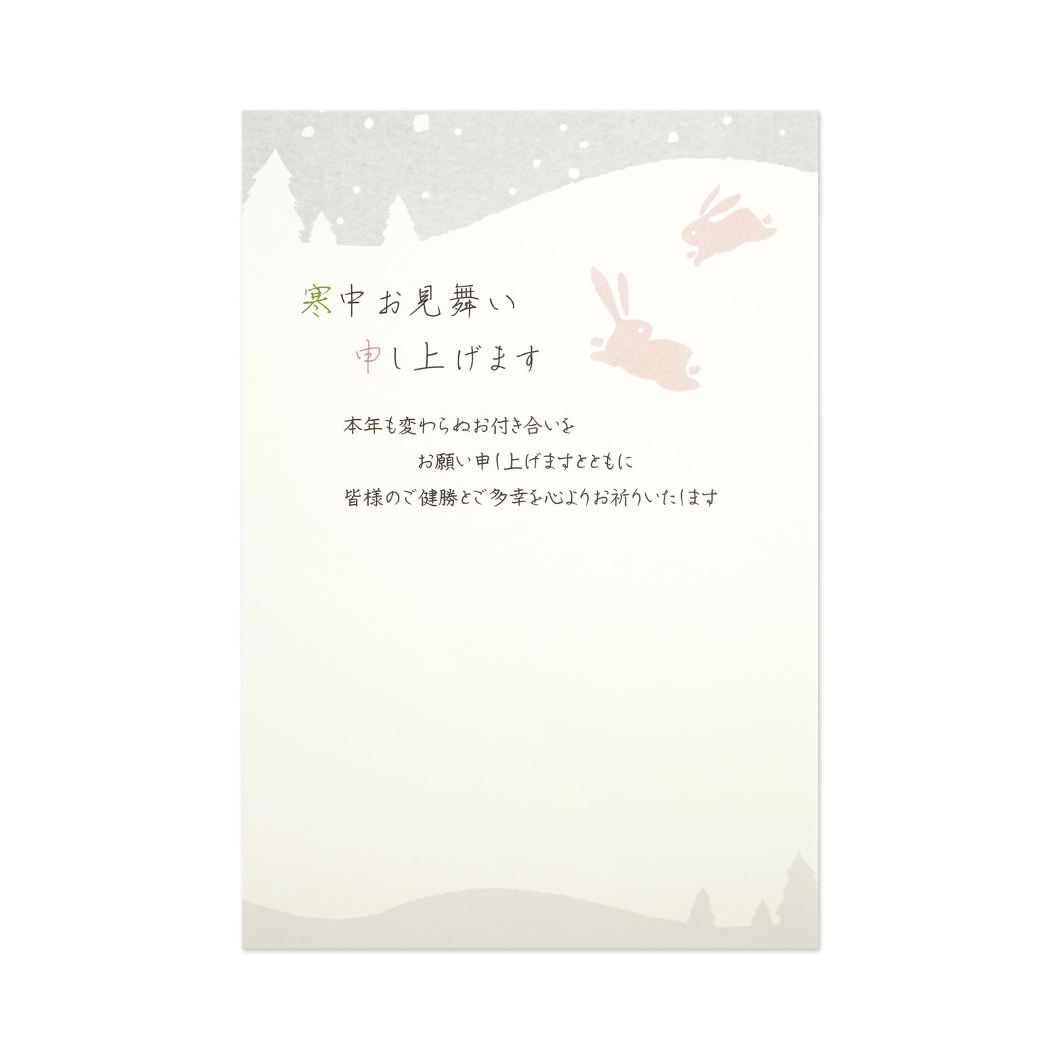 【仕様】●内容3枚入り●サイズ148×100mm来年もご使用いただけるかわいいデザインの寒中はがきです。同デザイン3枚入り。寒中はがきは、松の内(1月1日〜1月7日)があけてから立春(2月4日頃)までに送る挨拶状です。寒中はがきの使い方1.年賀状を出すのが遅くなり、松の内を過ぎてしまった時に。2.出す相手や自分自身が喪中の時に。年賀状の代わりに出す挨拶状として。3.喪中と知らずに年賀状を出してしまった相手へのお詫び状として。4.喪中と知らずに年賀状を下さった相手へのお返事として。※こちらの商品は私製の寒中はがきです。お手数ですが、切手はお客様ご自身でご用意ください。