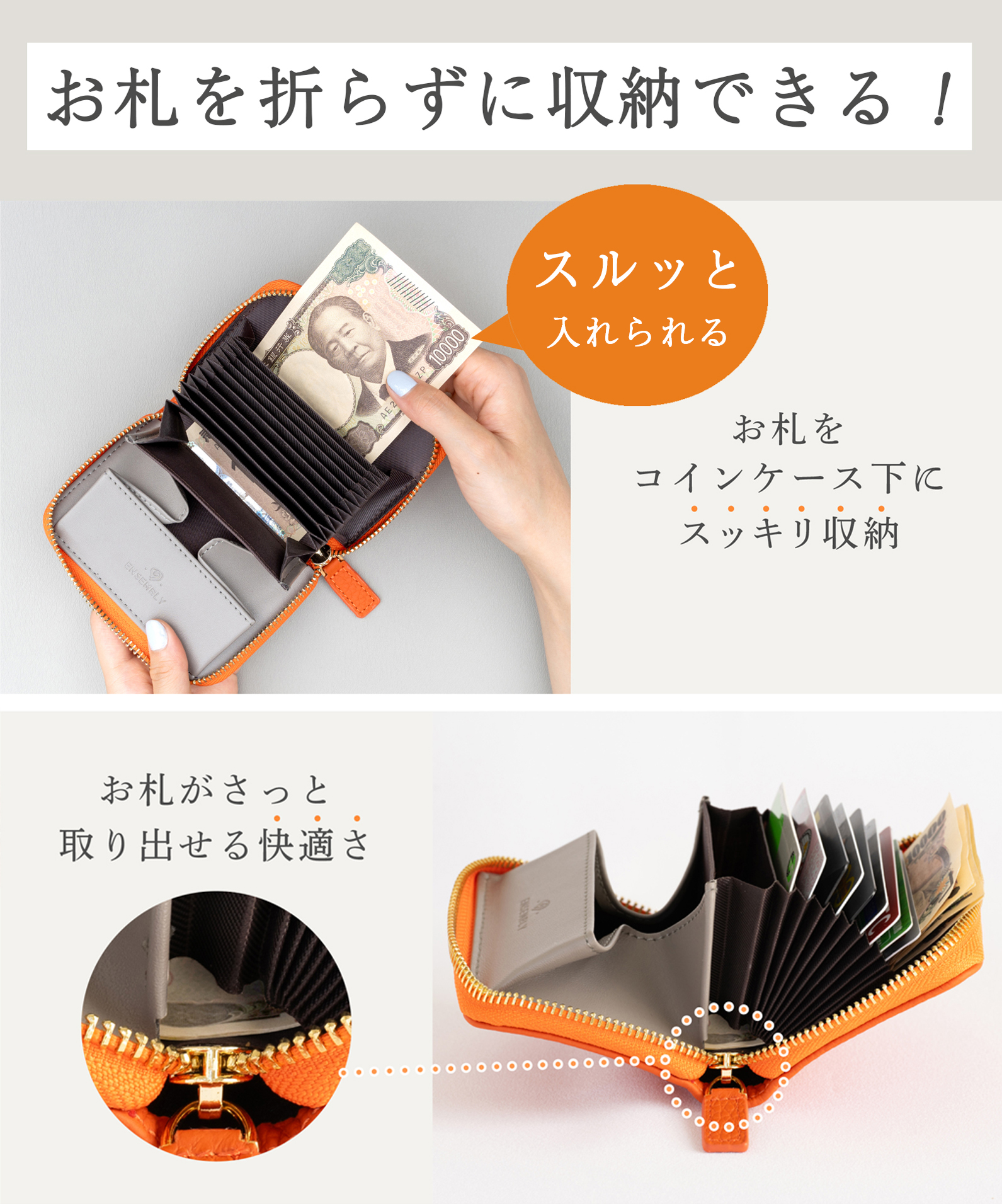 お札が折れない: 小銭入れの裏側に隙間がありお札を折り曲げずに収納できる。