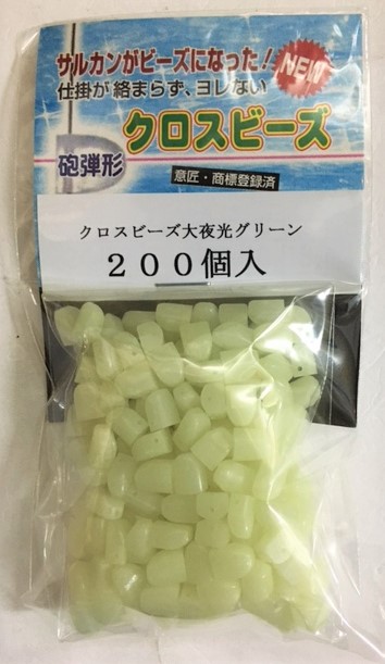 今や船の仕掛作りには欠かせないクロス回転ビーズ(クロスビーズカラーグリーンカラー(夜光効果もあります)が、200個でお買い得です。