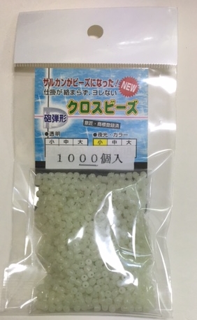 今や船の仕掛作りには欠かせないクロスビーズ(回転ビーズ)の砲弾型、夜光グリーンカラー、小サイズです。