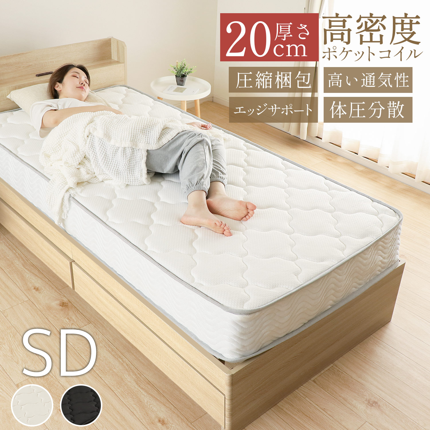ポケットコイルマットレス セミダブル マットレス 寝具 厚さ20cm エッジサポート コイル スプリング 圧縮梱包 ホワイト ブラック ベッド
