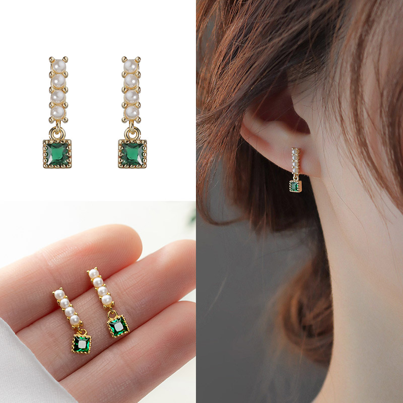 艶やかな小粒パールを縦に4つ並べ、その下にスクエアカットのエメラルドカラーストーンをあしらった、クラシカルで上品なスタッドピアスです。
