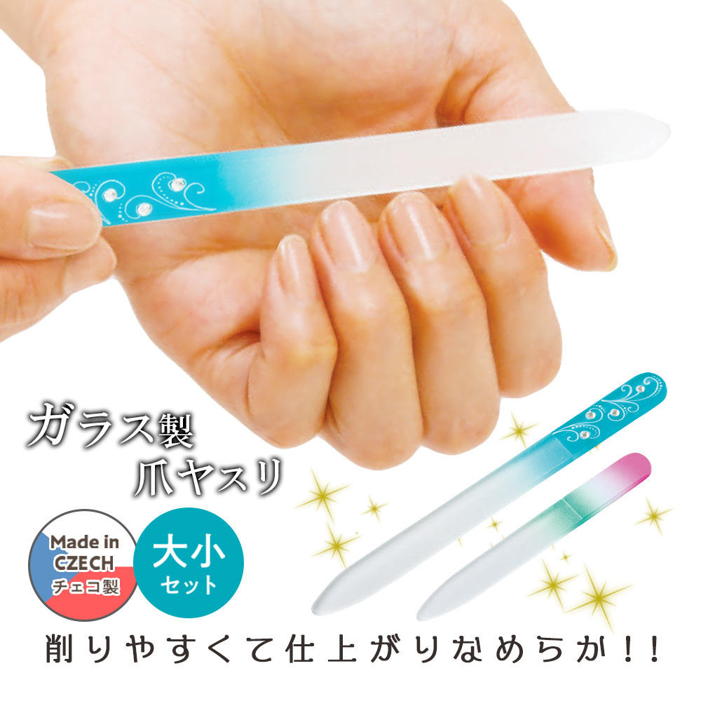 ガラス製爪ヤスリ大小2個セット コバルト チェコ製 ネイルケア ネイルファイル 水洗い可 衛生的 爪やすり 爪磨き なめらか ガラス製 携帯用