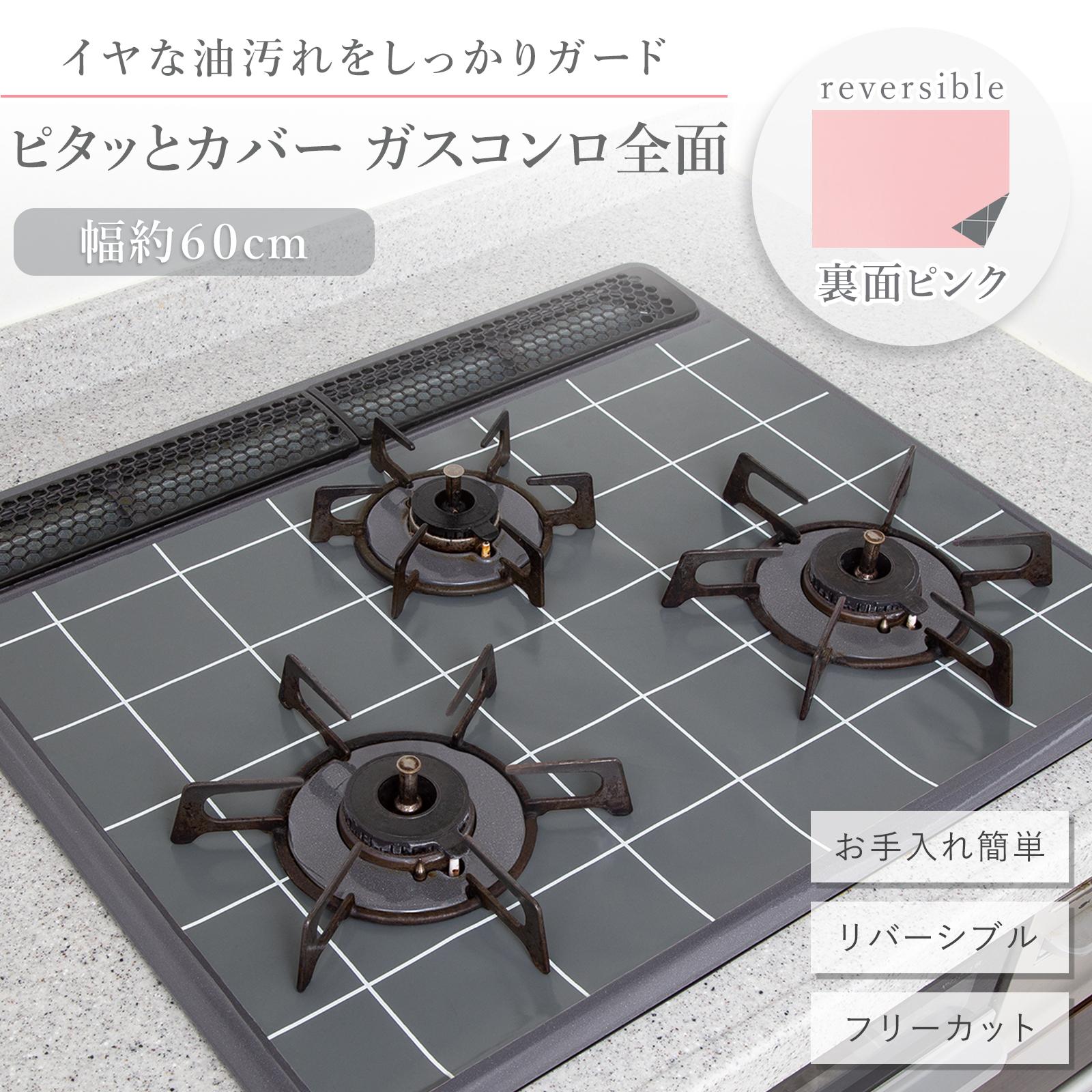 ピタッとカバー ガスコンロ全面 幅60cm用 耐熱温度250度 カットOK 水洗いOK シリコン 手入れ簡単 リバーシブル バーナーリング型紙付 掃除