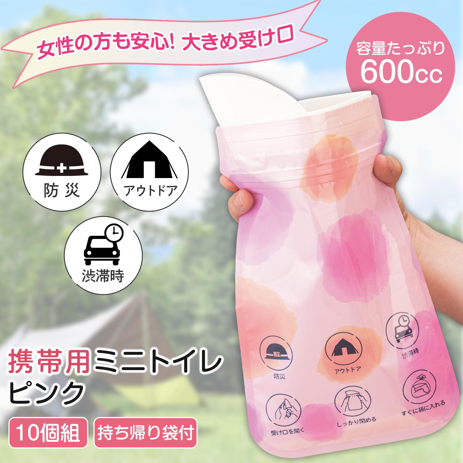 携帯用ミニトイレ ピンク 10個組 600cc 大容量 受け口 大きめ ワイドサイズ 16cm 持ち帰り袋付 男女兼用 防災 災害 アウトドア 渋滞