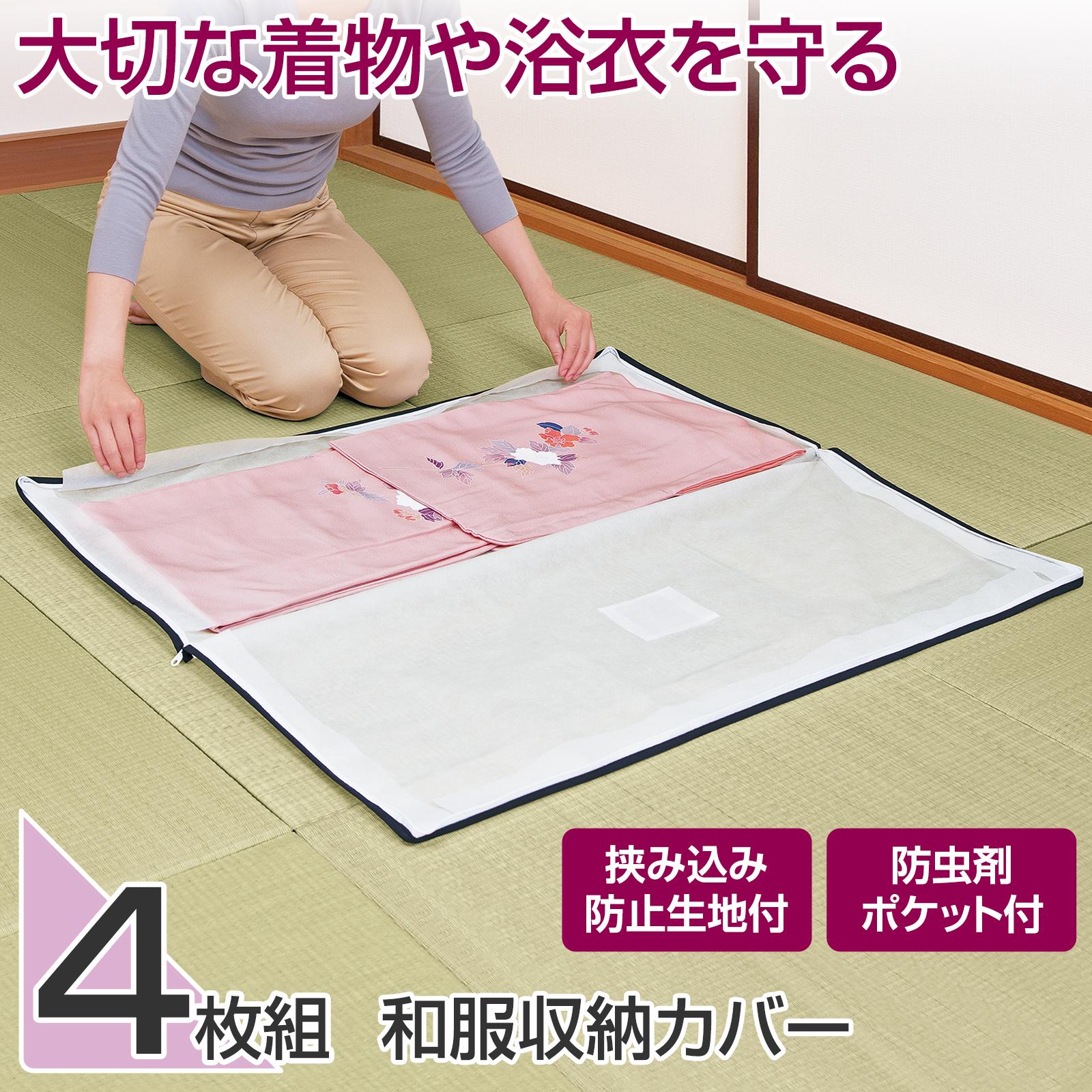 和服収納カバー 4枚組 着物 浴衣 ダブルファスナー コの字 挟み込み防止 防虫剤ポケット 不織布 通気性 丈夫 湿気 ニオイ こもりにくい ホコリ