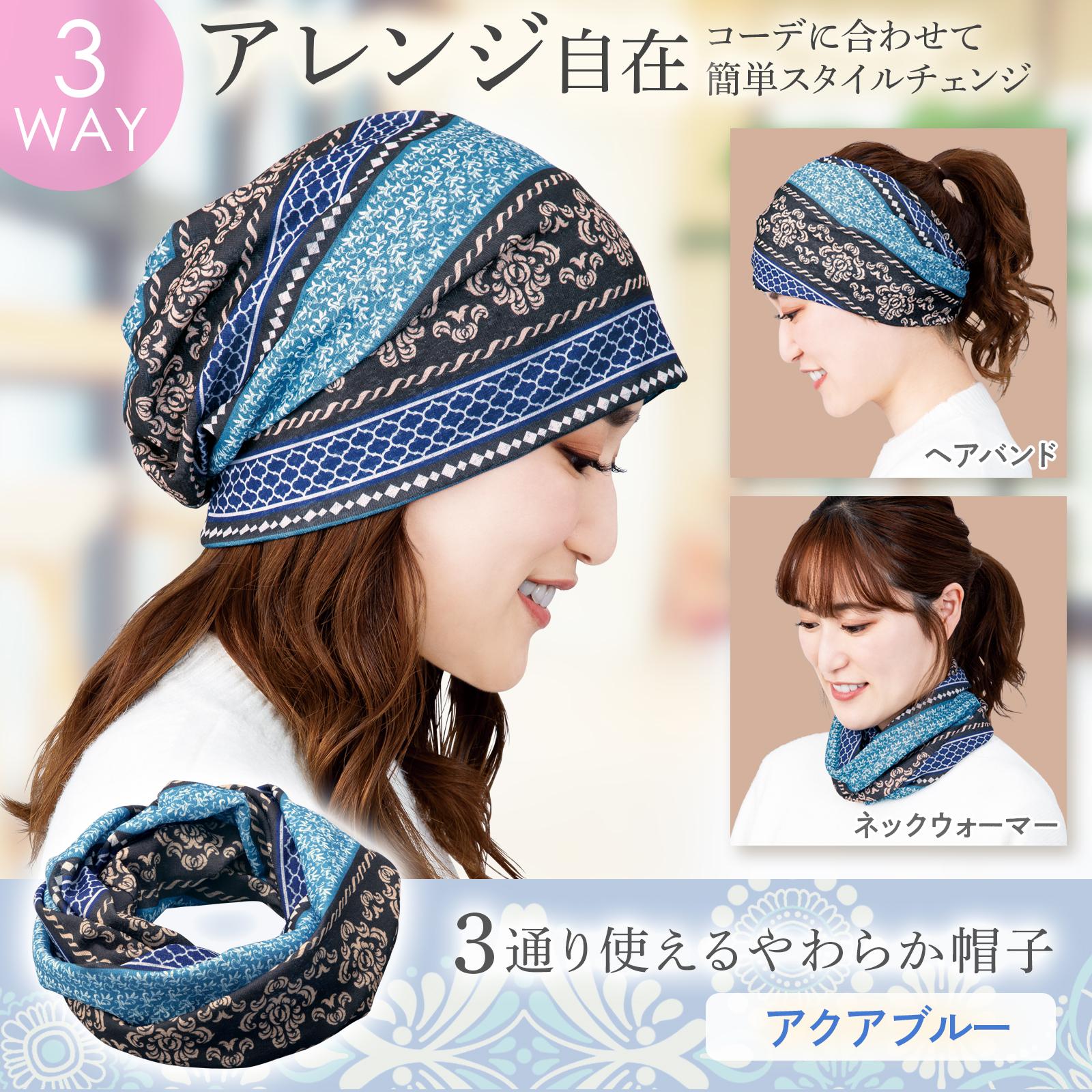 3通り使えるやわらか帽子 アクアブルー 帽子 ヘアバンド ネックウォーマー エスニック 通気性 伸縮 薄い 柔らかい かさばらない コンパクト 収納