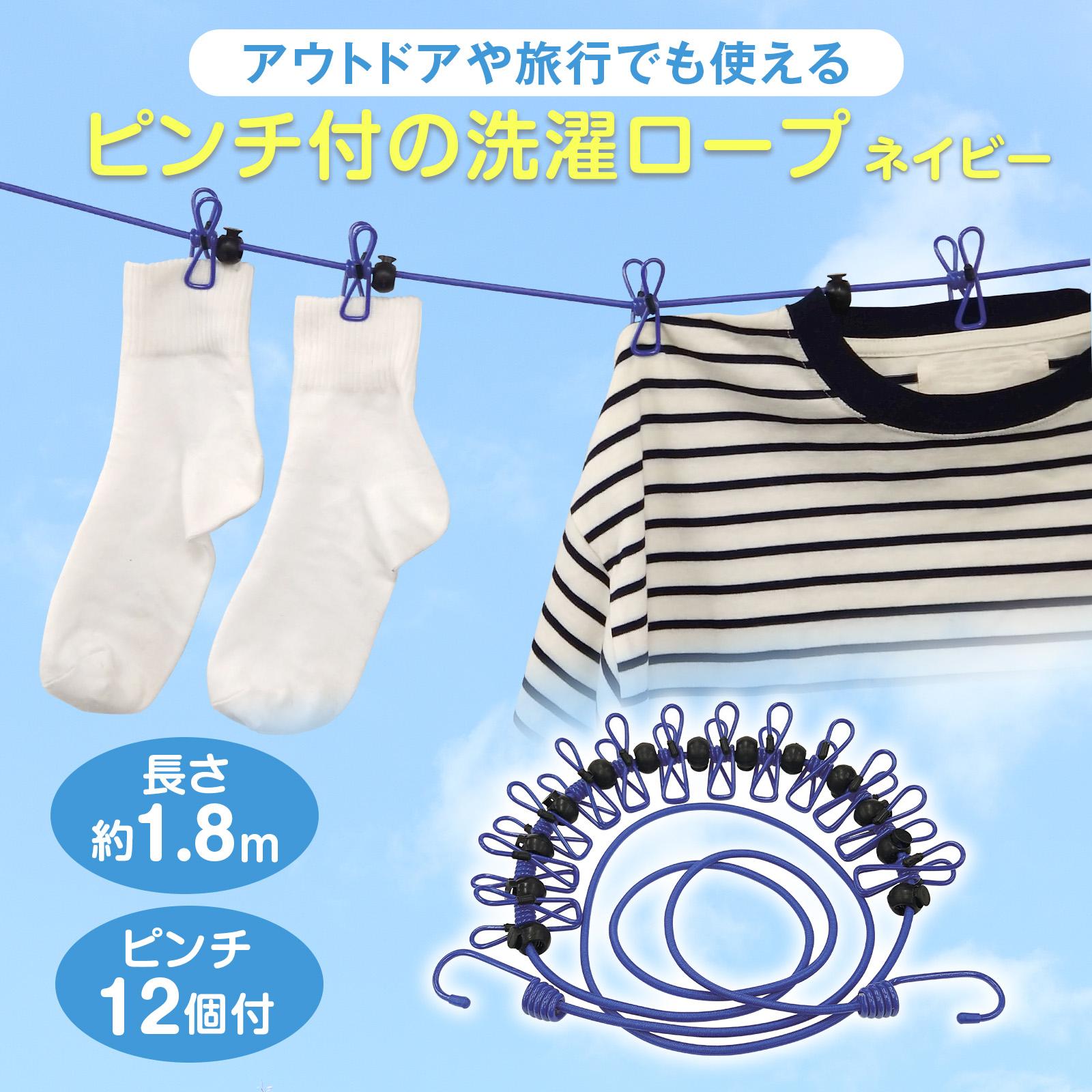 ピンチ付の洗濯ロープ ネイビー 旅行 出張 キャンプ 室内 室外 洗濯 部屋干し 伸縮 持ち運び 海外旅行 洗濯ヒモ 暴風 アウトドア 室内干し ピンチ