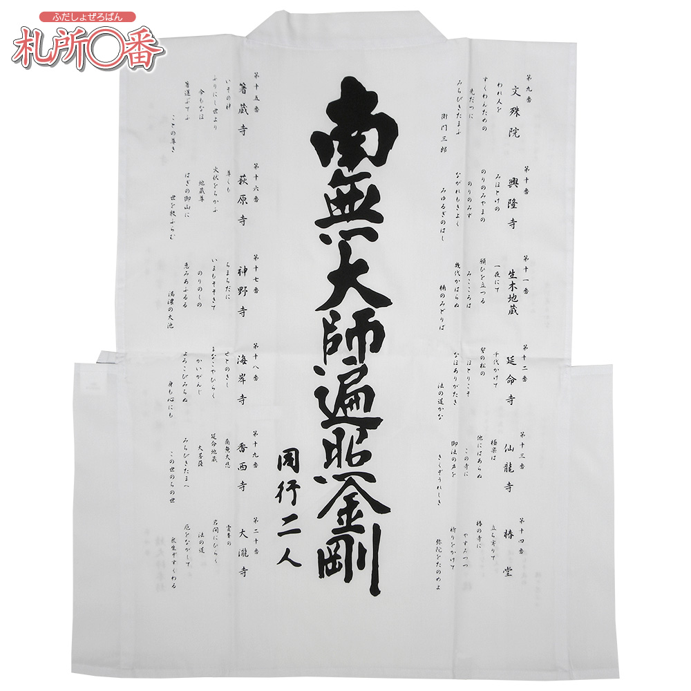 「四国別格二十霊場白衣(おいずる) 朱印用」は、四国別格二十霊場を巡礼して、ご朱印をいただくための白衣(おいずる)です。一般に寺院巡礼用の白衣は古来より笈摺(おいずる)と呼ばれでいます。四国別格二十霊場第1番大山寺から第20番大龍寺までの20ヶ寺の寺院名とご詠歌が衣に印刷されています。また、背中上部には、南無大師遍照金剛と同行二人(どうぎょうににん)の文字が印刷されています。