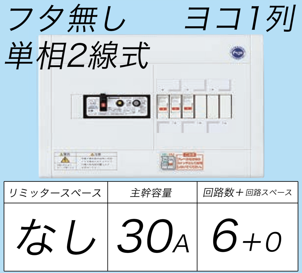 露出・半埋込両用形/ドア無/リミッタースペース無/ヨコ一列/単2/主幹:漏電ブレーカ(ELB)/主幹:ELB30A分岐:6+0/プラスチック製/色名:ホワイトマンセル記号10Y9/0.5