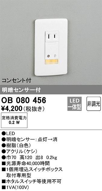 OB080456:フットライト 明暗センサ付 非調光(電球色) コンセント付