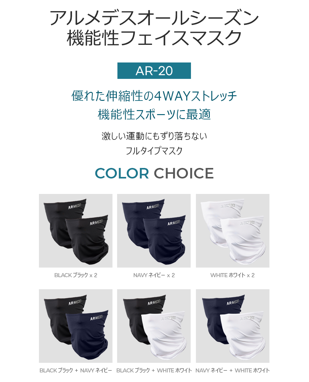 2枚セット 送料無料 ARMEDES 機能性 フェイスマスク 接触冷感 吸汗速乾 通気性 ストレッチ 洗える ユニセックス 男女兼用 フリーサイズ オールシーズン AR20