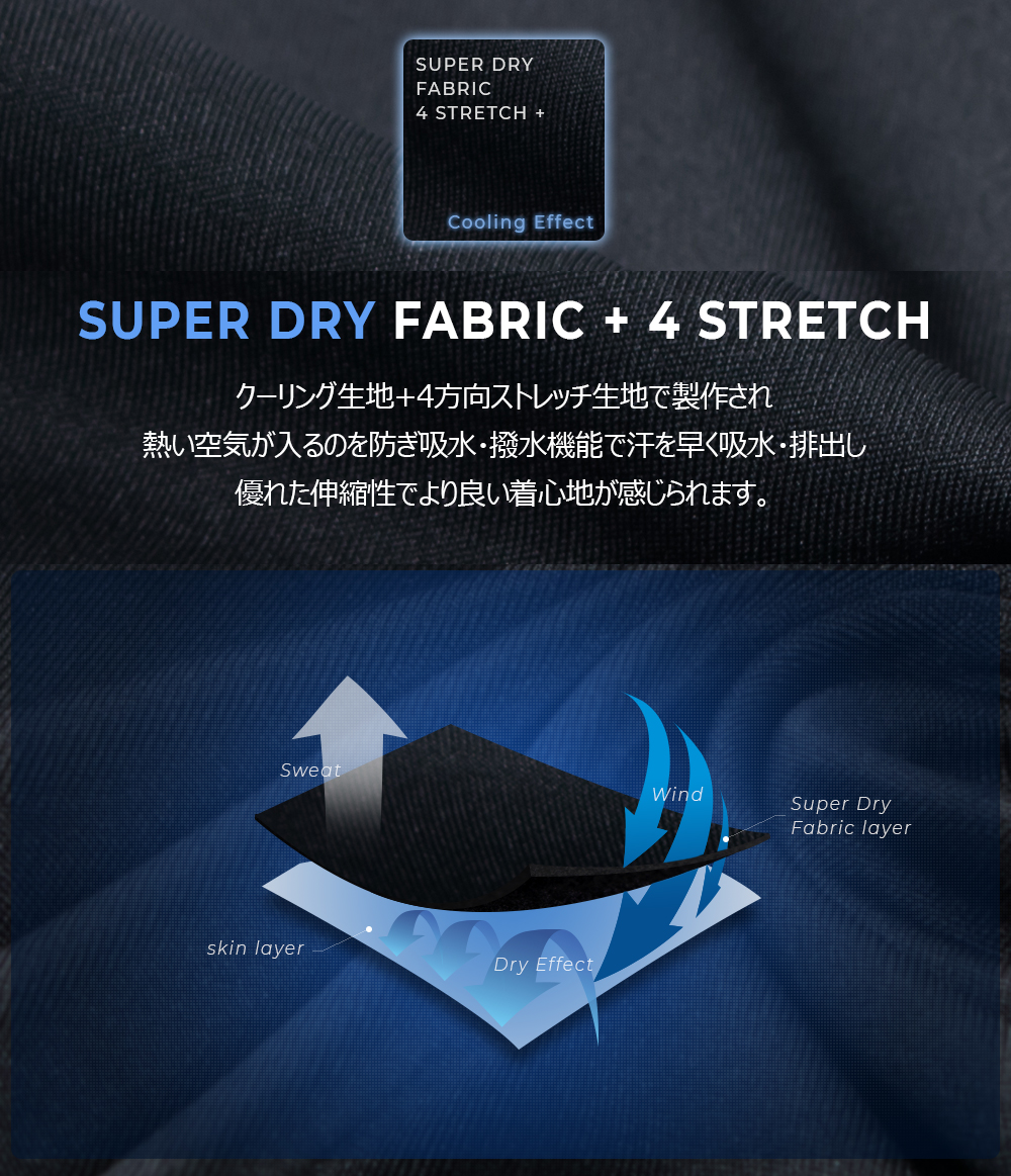 吸汗速乾機能で汗を素早く吸収し肌にくっつかない生地を採用しているため、長時間の使用でも快適さを維持します。