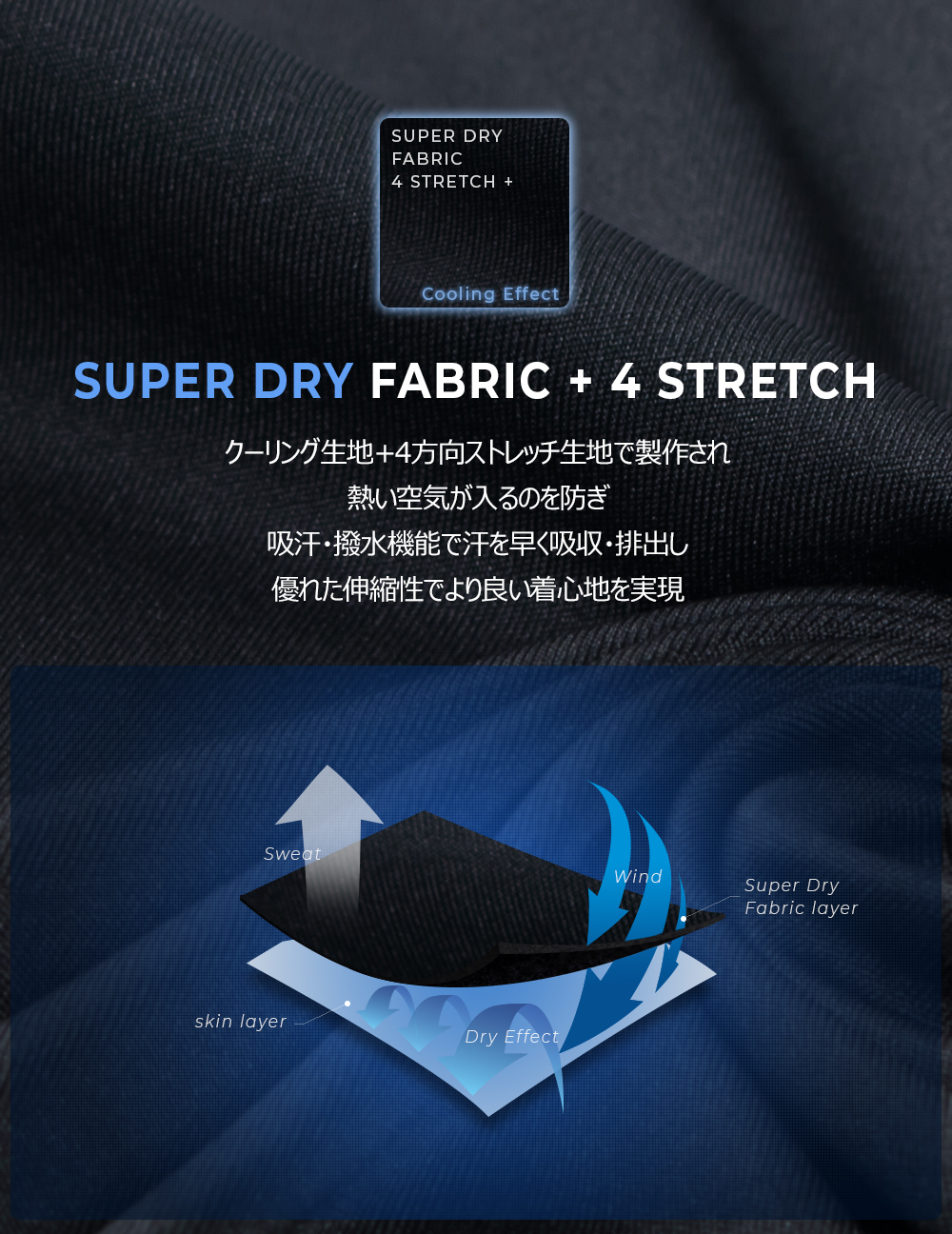 機能が汗を素早く吸収・発散し、いつでもドライな着心地を提供。