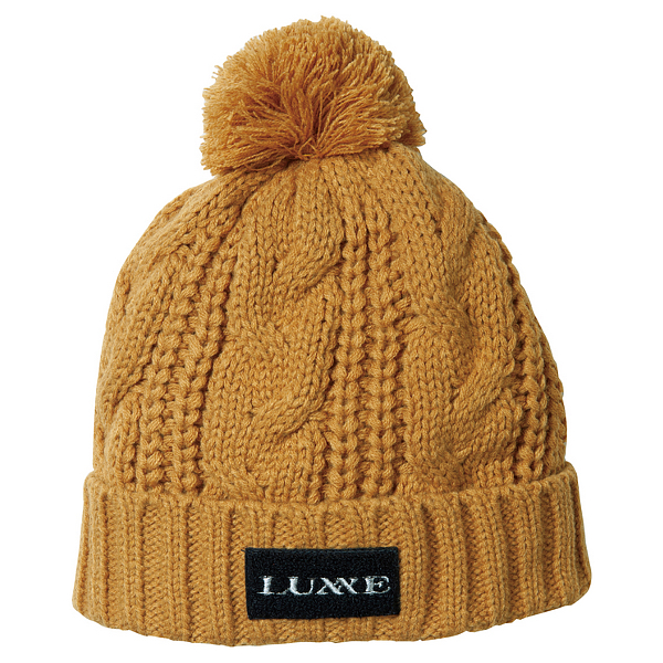 ローゲージのケーブル編みにポンポンをあしらった温かみのあるニットキャップ。編目の数が多いので、適度なボリュームがあるのが特徴。