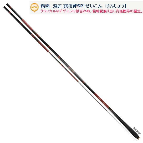 先調子でへら〜中型鯉に対応、軽量タイプの【源匠SP】、大型鯉にも対応可能なパワーを持つ【源匠鯉SP】の2機種をラインアップ。競技の場所や状況に合わせて、ベストな選択をする事が可能です。高品質の高弾性低樹脂高強度カーボンを惜しみなく使用し、グリップにも綾織りを施したスリーブタイプのグリップを採用し、見た目の高級感と共に、滑りにくくフィット感が高い機能性を持ち合わせており、より握りでのストレスを低減しています。穂先は高強度タイプのしなやかなソリッドタイプを採用、大幅に引き上げられた、曲がりに対しての高い限界点を実現したソリッドで、現場での不意のトラブルの防止に高い性能を発揮。ストレスを軽減し、より集中力を高めます。またデザインには工芸品のような飽きのこないクラシカルなデザインが施されており、充実の装備と信頼の調子と共に、心地よい所有感を満たせるように作成しております。釣る喜びと持つ喜びを味わえる一竿がここに完成いたしました。