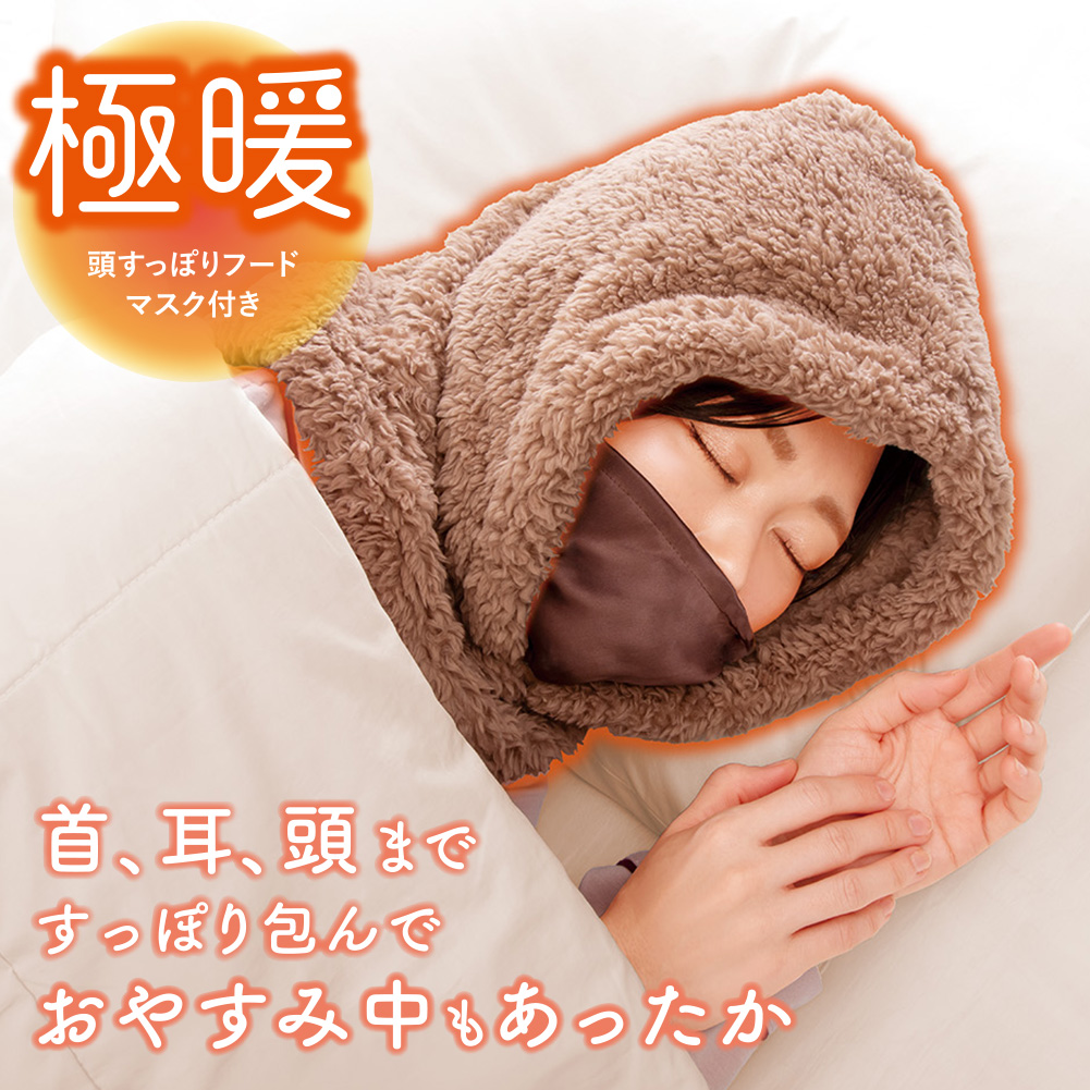 布団では覆われない首から頭の先まで極暖生地ですっぽり包んで暖気を逃しません。