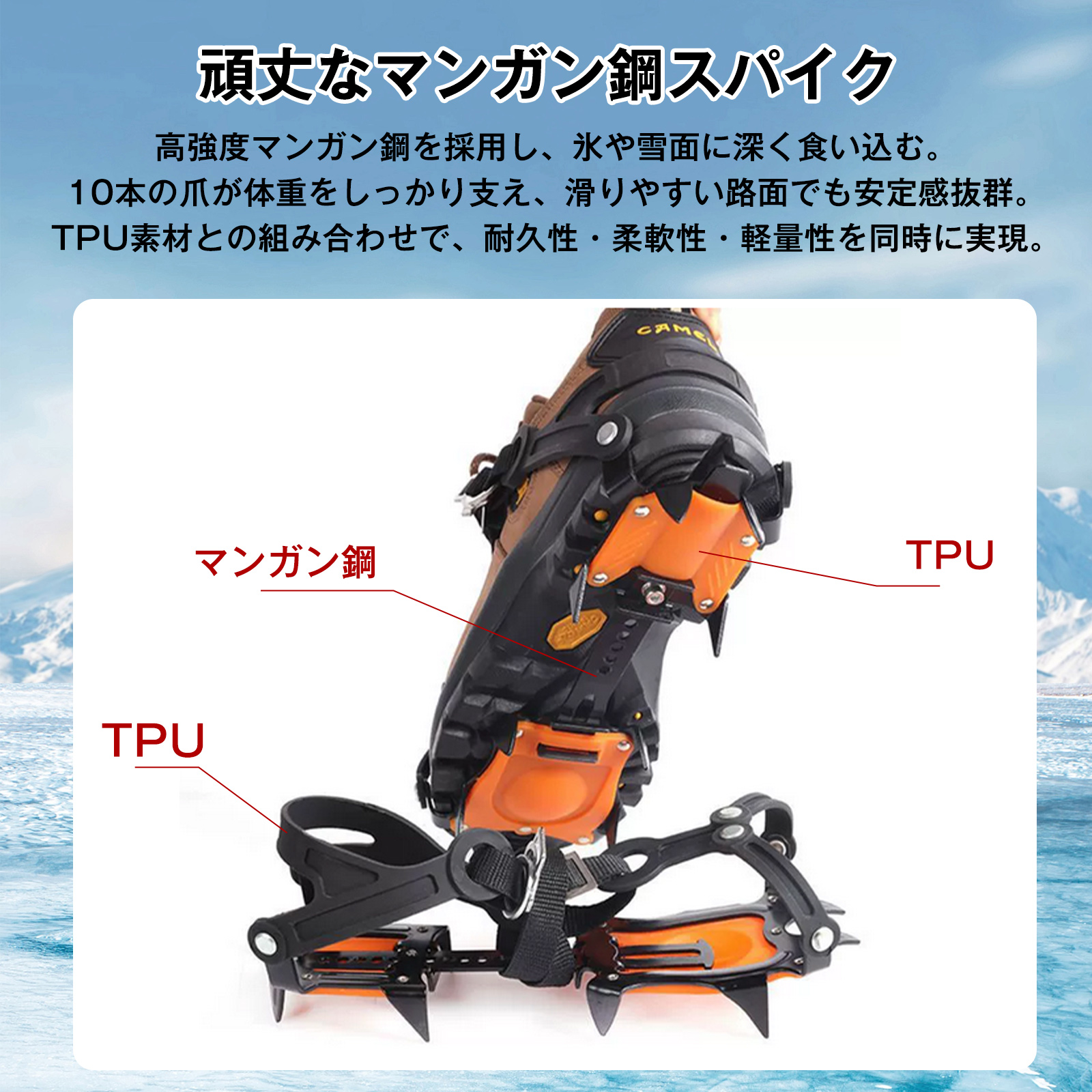 アイゼン スノースパイク 10本爪 靴底 サイズ調整可能 マンガン鋼+TPU 脱着 簡単装着 雪 滑り止め 靴 滑りとめ 雪 安全 雪道 凍結 スノー ブーツ 雪対策
