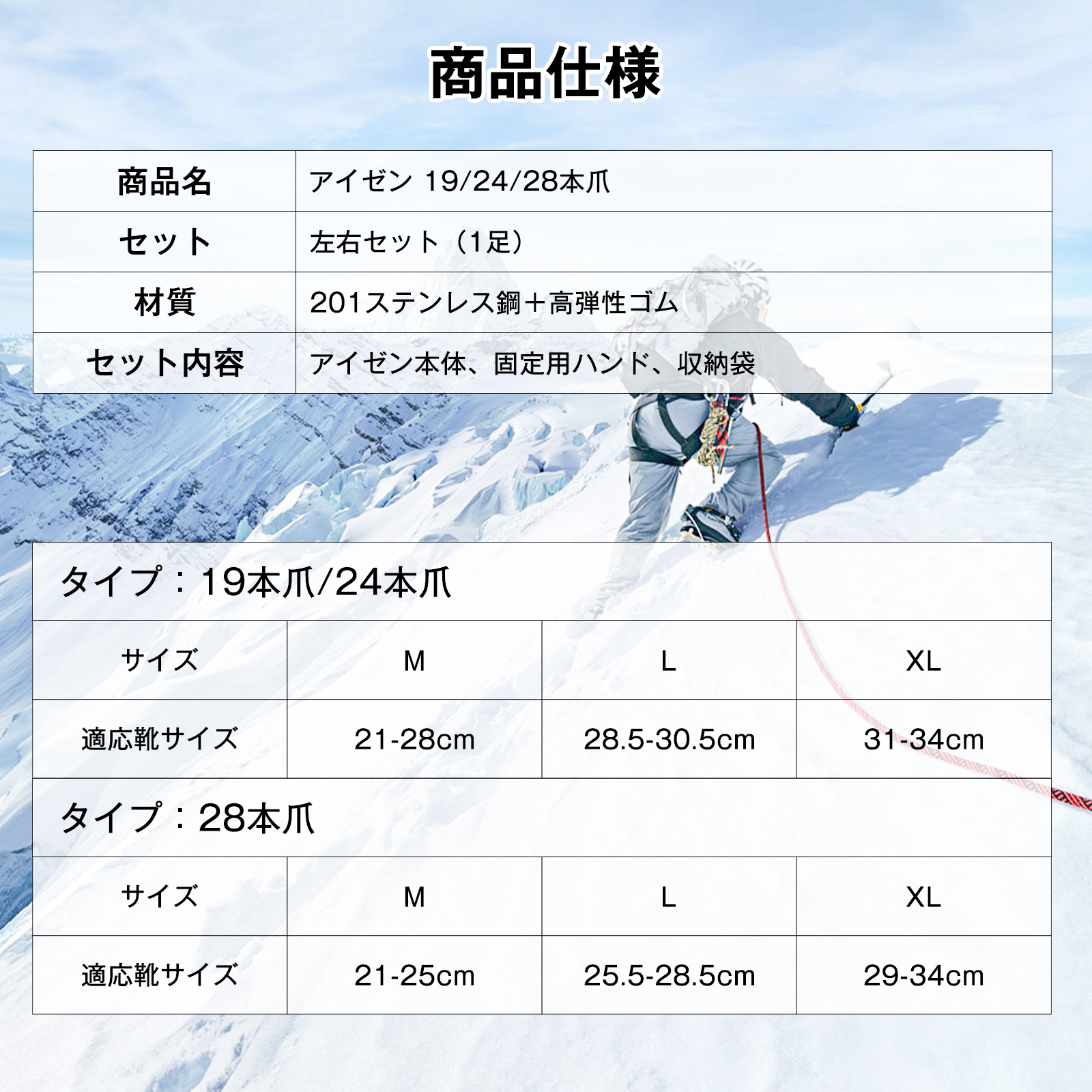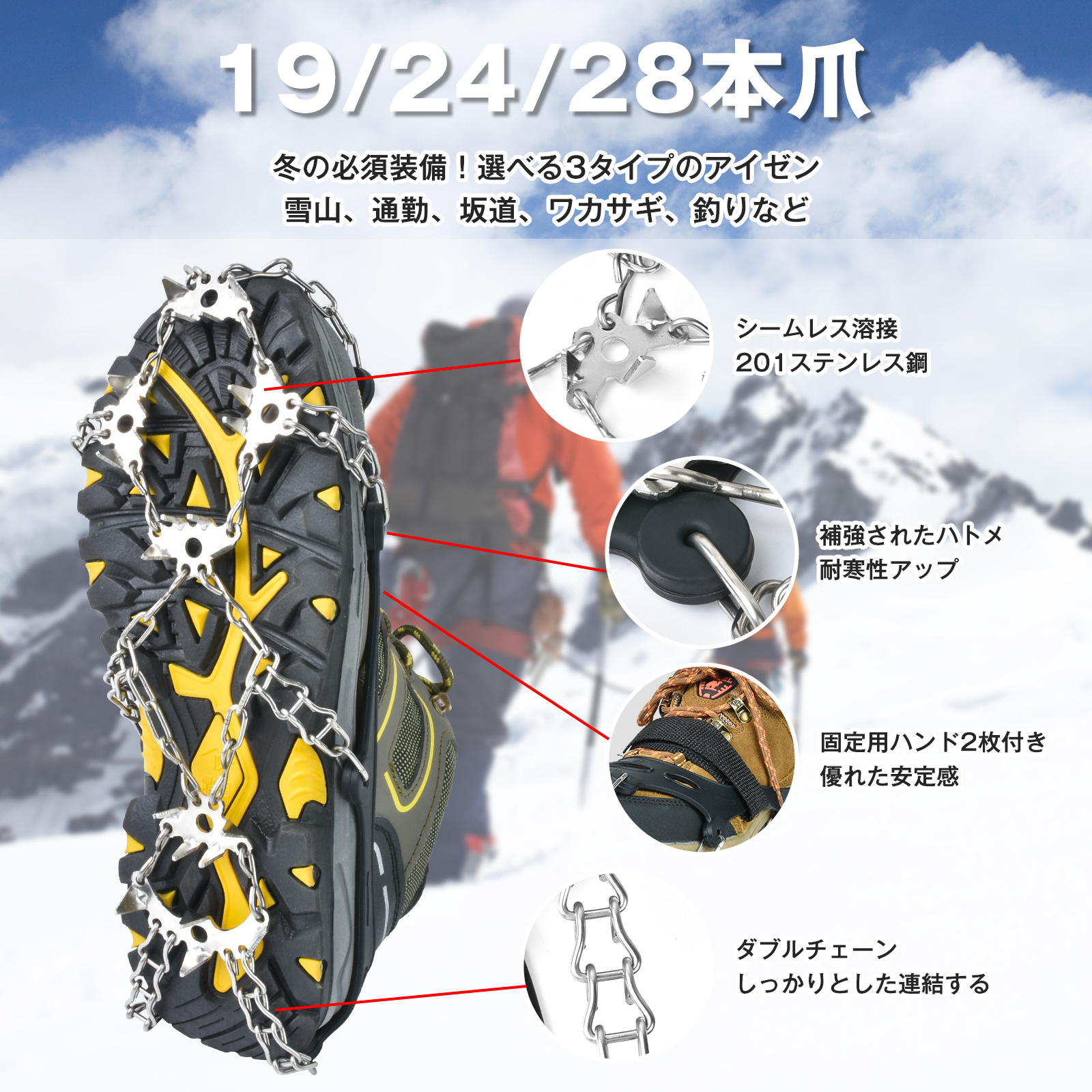 アイゼン スノースパイク 19/24/28本爪 雪 滑り止め 靴底 チェーンスパイク 登山 トレッキング 雪山 凍結道路 メンズ レディース キッズ 簡単装着