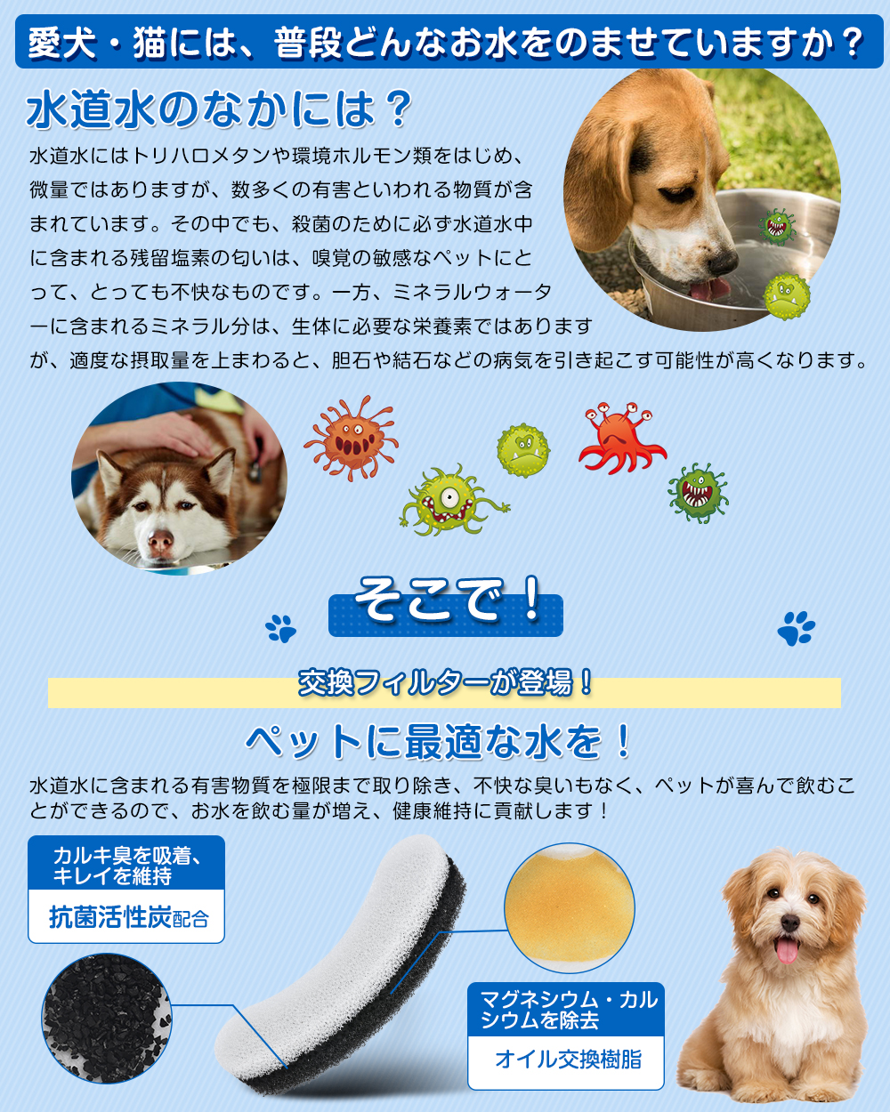 マグネシウム、カルシウム類は動物にとって大切なミネラルですが、多く摂りすぎてしまうと、結石など病気の原因になる可能性があります。軟水化フィルターには2種類の入れ物があり、一つイオン交換樹脂です。イオン交換樹脂は水道水のマグネシウム、カルシウムを除去し、水道水を軟水にします!大切な猫ちゃんやワンちゃんにやさしい水分補給を提供し、下腹部尿道の健康維持に!また、あまり水を飲まない子にも水分を多く取らせ、排尿の回数を増加させることも大切です。