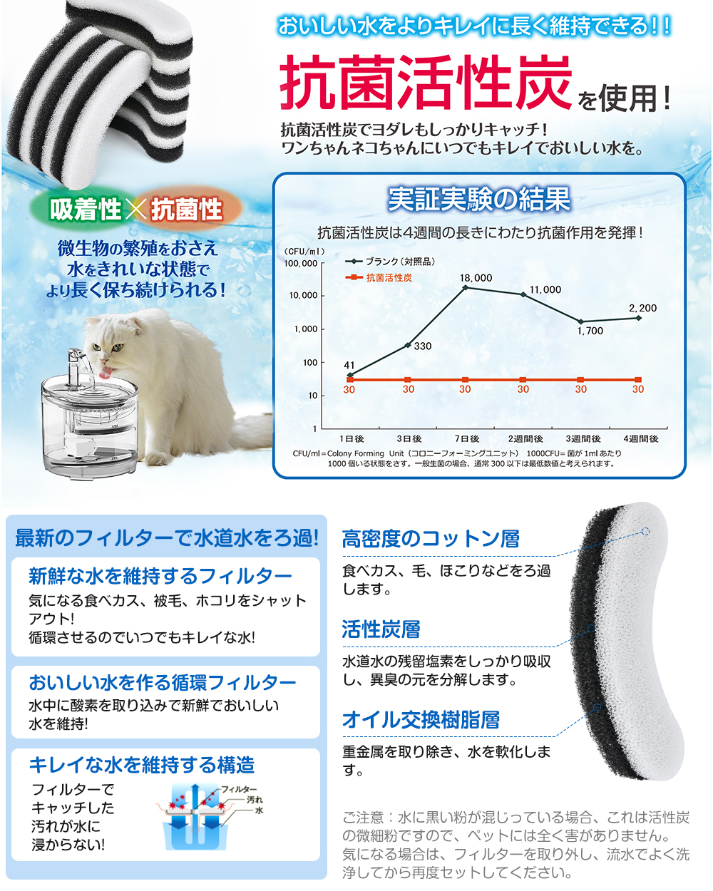 軟水化フィルターに2つ目の入れ物は、即効性の活性炭となりなります。カルキ臭や匂いをしっかりろ過吸着し!カルキ臭を嫌がる猫ちゃんもやっと安心して水飲みできます!いつでも新鮮でキレイな水を提供するので、飲水量アップに貢献します。