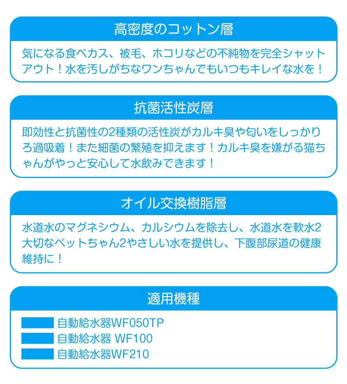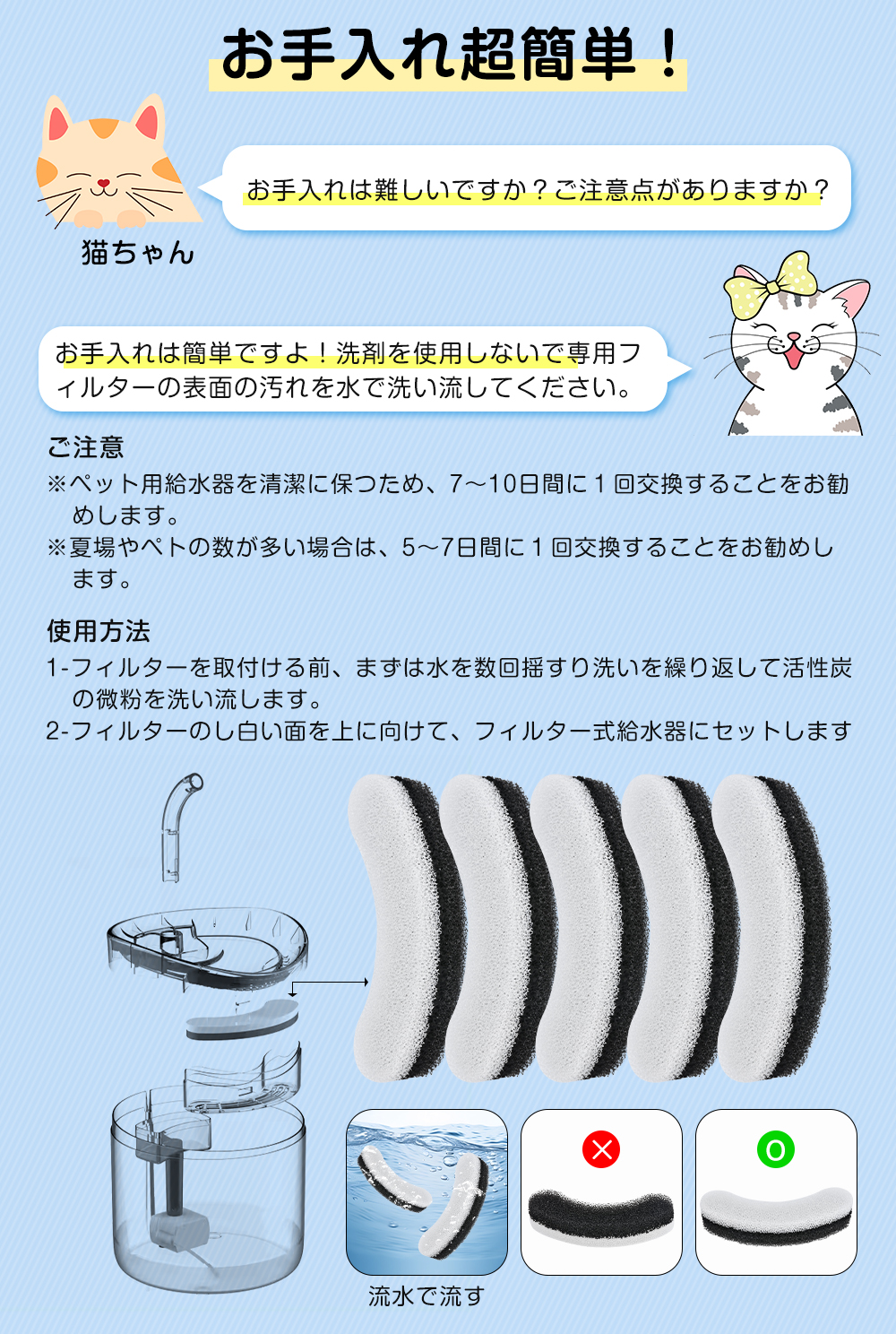 軟水化フィルターのカバーは厳選した高密度PP綿層でできて、気になる食べカス、被毛、ホコリなどの不純物を完全シャットアウトし、水を汚しがちなワンちゃんでもいつキレイな水を提供します!表面と底面の二重高密度PP綿層となりますので、ろ過能力をきっちりアップします。