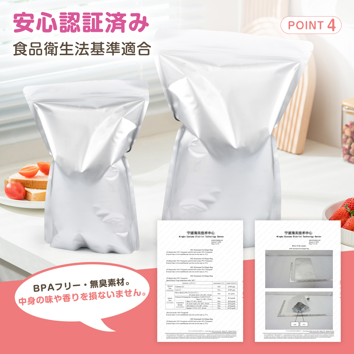 三層構造(PET+アルミ+食品グレードPE)で、光・空気・湿気をしっかりブロック。