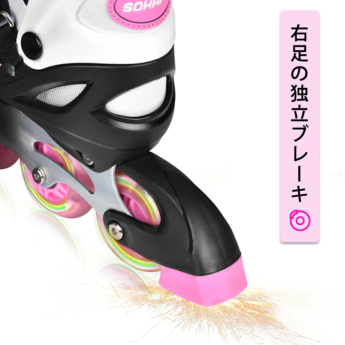 三重プロテクションシステム、標準的な安全バックル&マジックテープ&靴ひもがあり、厚みのあるクッションが痛い靴擦れや衝撃から足首を守り、安全性と快適さを保ちます。充電不要のホイールが回るとキラキラと光る★滑るときにピカピカと光ってカッコイイ!8つの発光ホイールのデザインです。運動の習慣に合わせて、左足は体重を支える、右足の独立ブレーキ、使い易くて安全です。