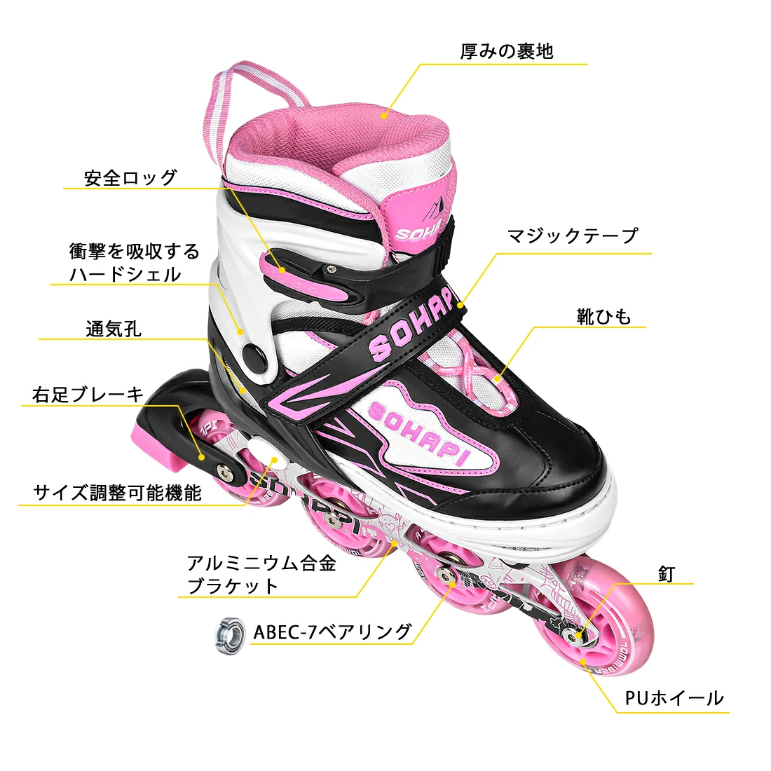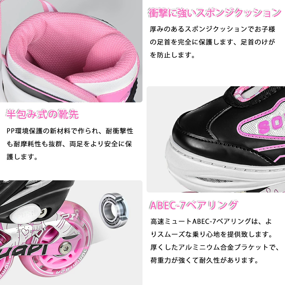 インラインスケートの表面高強度衝突の対策を講じ、衝撃吸収材を使用し、振動を防ぎ安定感があります。安全性と快適さを確保します。一列四つのスケートの構造で、実用範囲で最高の精度となっているABEC-7のベアリングを採用して、安全性が高くて、スムーズな体験も楽しめます。インラインスケートを順調に回ると同時に静音性も優れ、頑丈で耐久性100kg、摩擦抗性が少なく、耐久性に優れ、長時間使用しても大丈夫です。通気性抜群で 軽くて良い履き心地をお楽しみください。長時間練習しても、足首には負担がかかりません。
