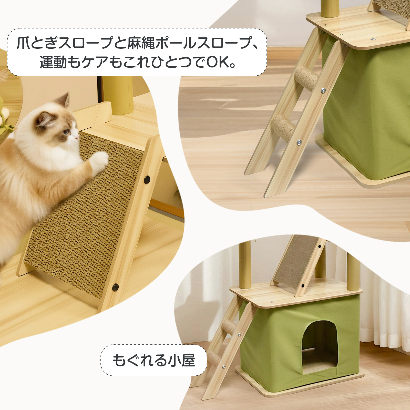 見晴らしのよい高台、大きい隠れ家、爪とぎポール、遊び放題の幅広い台座、宇宙船などを付けます。
