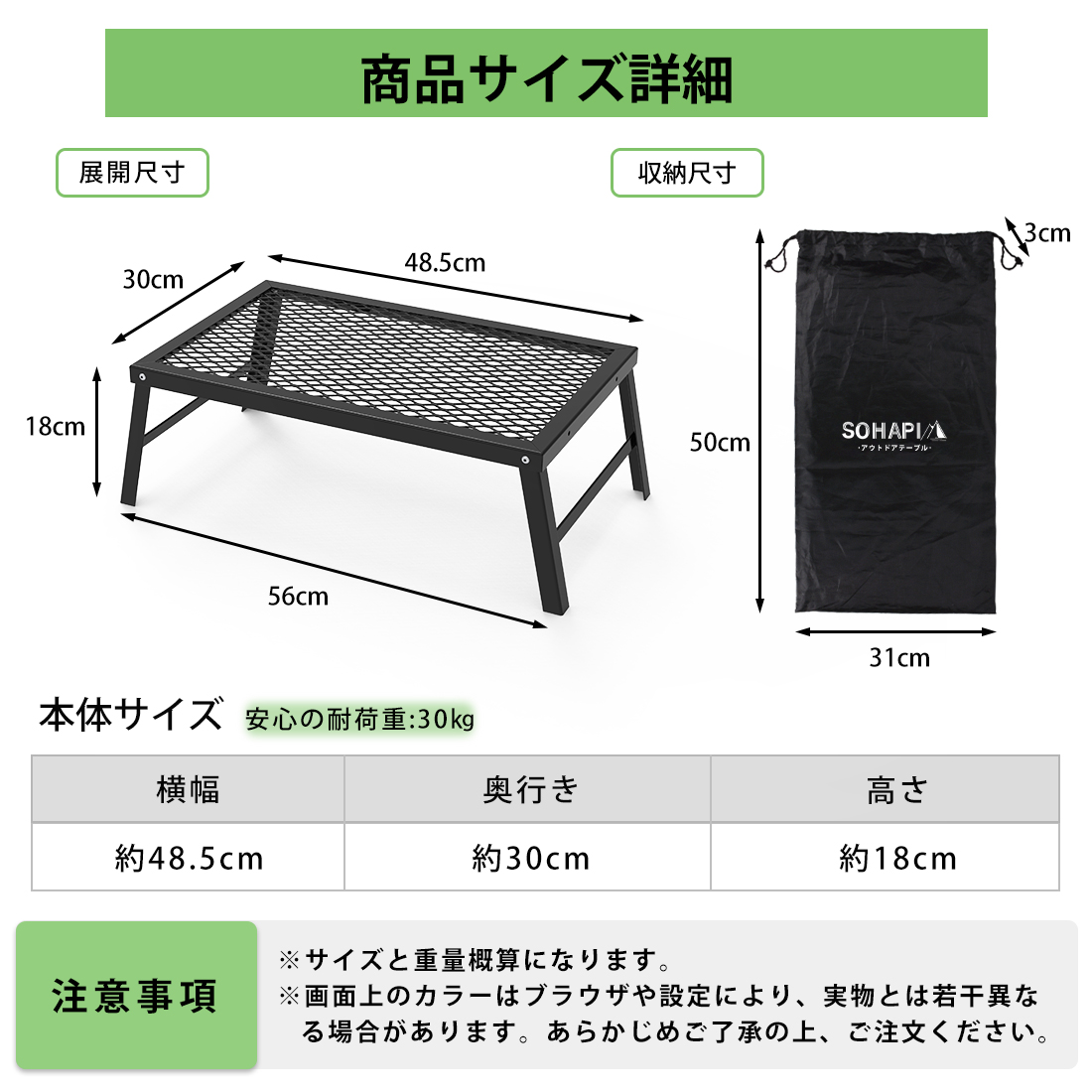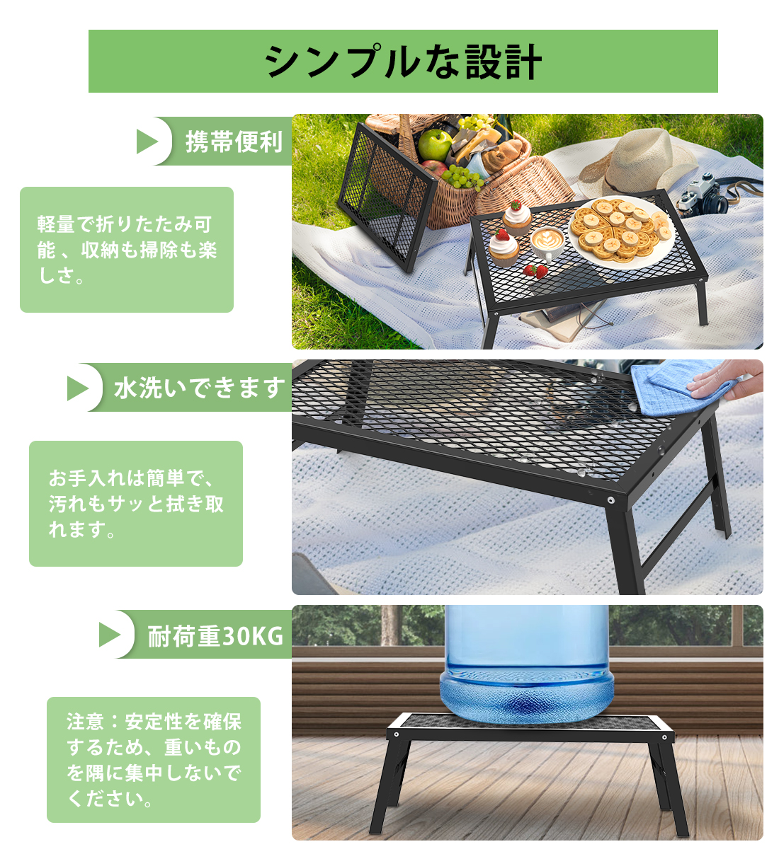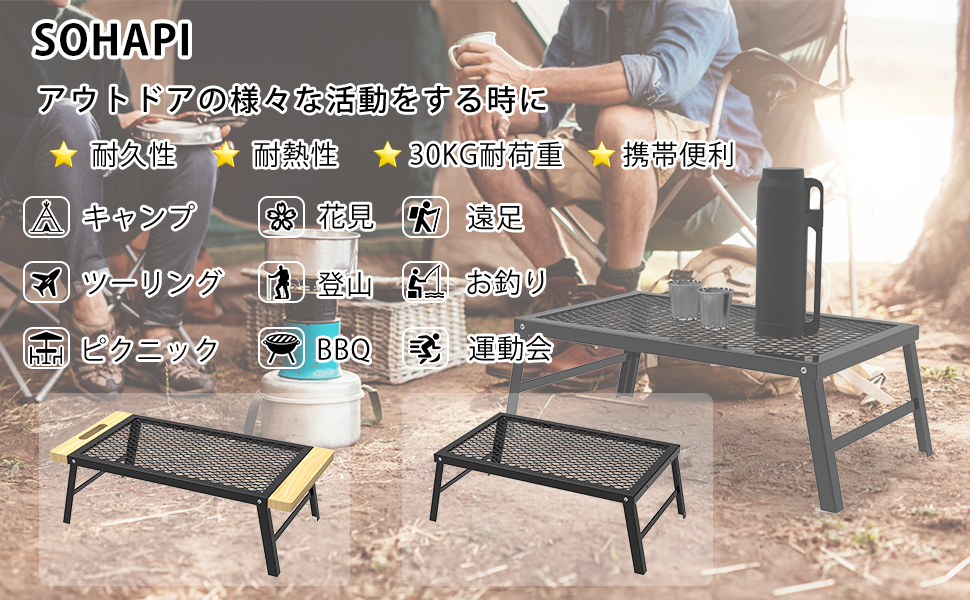 木目の美しい加工松木とスチールの質感が融合した設計で、アウトドアのキャンプシーンを盛り上げます。エッジ付き、たき火テーブルとして使用する場合、少し移動したいときにも直接触れることができ、とても便利です。折り畳み式テーブルの足は「ハ」の字状に開き、安定性に優れて、転倒しにくいです。最大耐荷重30 KGの信頼性の高い設計で、重いものも簡単に置けます。汚れていても全水洗が可能で、実用性と耐久性を兼ね備えています。