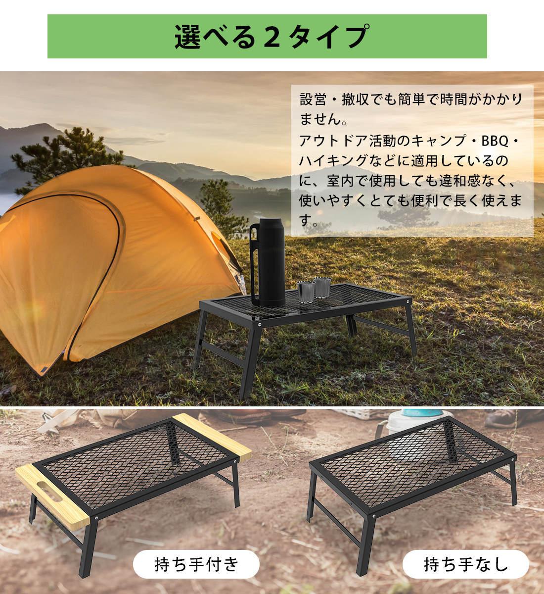 キャンプ、テント泊、ソロキャンプ、ピクニックやバーベキュー(BBQ)、ツーリング、登山などの活動に最適です!自宅でも野外でも使えます。アウトドアテーブル・大型ゴトク・物置テーブル・アウトドア調理台・クッカースタントとして使用可能なキャンプテーブルです。