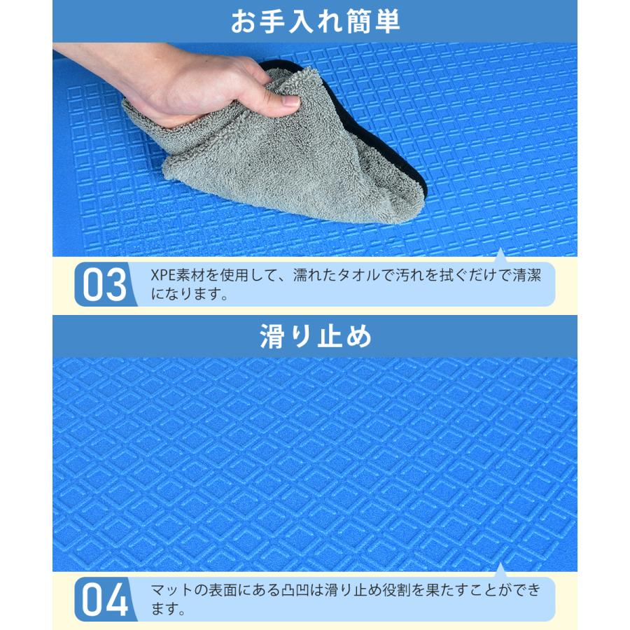 プールマットは抗菌XPE素材でできており、割れにくく、安全で無害な素材を使用しています。また、頑丈で漏れ防止で、超軽量で持ち運びが簡単です。プールをしっかりと保護し、お子様やペットに安心してご利用いただけます。吸水性が非常に高く、水を素早く吸収するため、プールサイドや浴室など水回りでの使用に最適です。さらに、特殊な加工が施された抗菌PE素材で作られており、雑菌やカビの繁殖を防止します。プールや浴室などの水回りでは、衛生面が非常に重要です。プールマットが抗菌効果を持つことで、安心して使用することができます。長期間使用しても変形や劣化がほとんどなく、プールや浴室などでの安全性とともに、高品質な製品として高く評価されています。