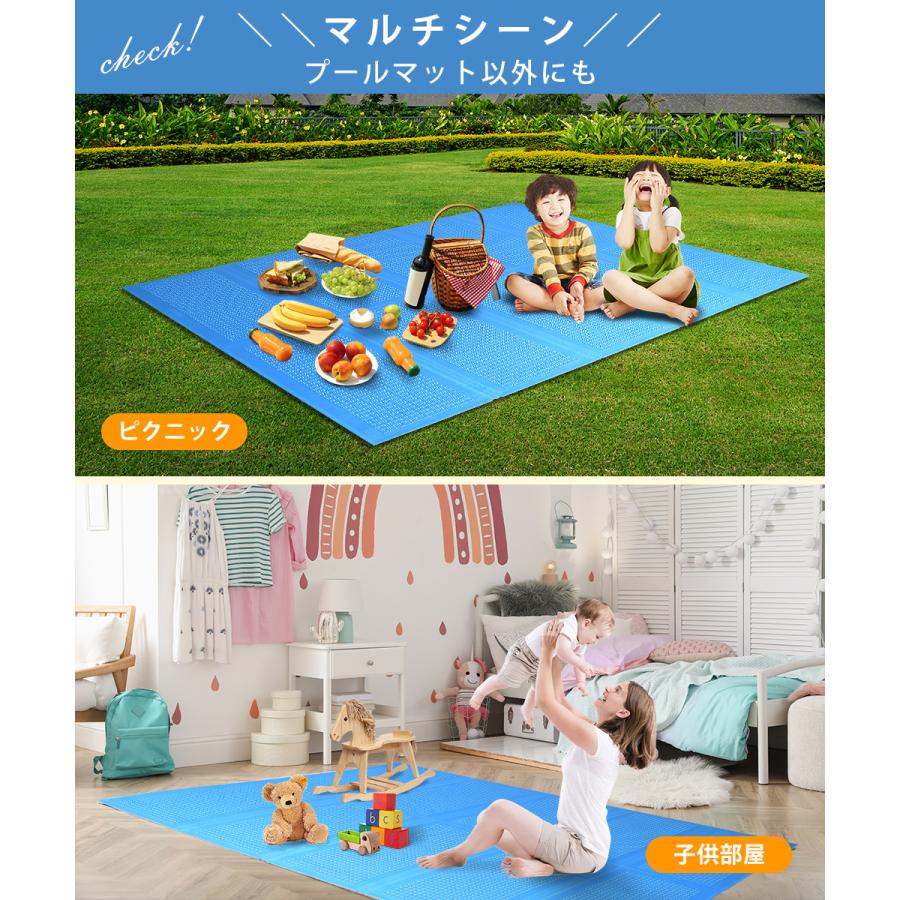 プールマットは、防滑効果があり、滑りにくくなっています。特に、子どもたちがプールで遊ぶ際には、安全性が非常に重要な要素となります。プールマットが滑りにくくなっていることで、安心してプールタイムを過ごすことができます。プールマットは床の布の上に敷くことができ、プール底部の摩耗や損傷を防ぐことができます。耐久性に優れており、長期間ご利用いただけます。耐久性が非常に高く、長期にわたって使用できます。プールマットは、コストパフォーマンスが優れているため、長期的な視野で考えた上で購入することができます。プールマットは折りたたみ式で、約860gの軽量で携帯可能で便利なあらゆる場所に簡単に移動できます。使用後はコンパクトに折りたたむことができ、場所をとらずに収納することができます。