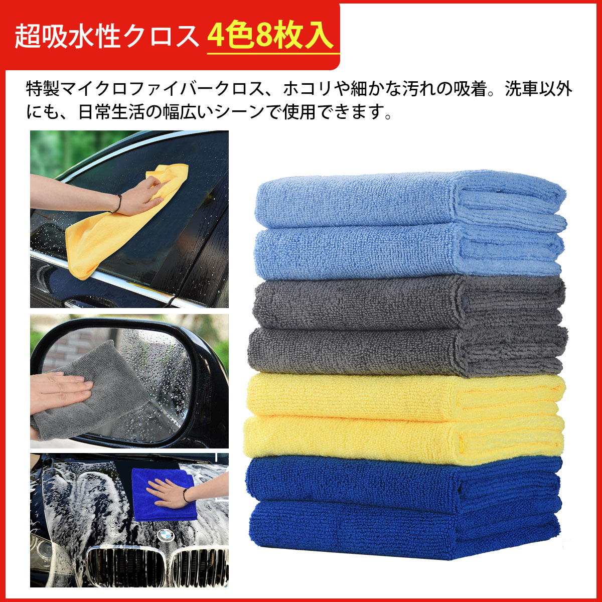 【超吸水性クロス 4色8枚入】特製マイクロファイバークロス、ホコリや細かな汚れの吸着。洗車以外にも、日常生活の幅広いシーンで使用できます。