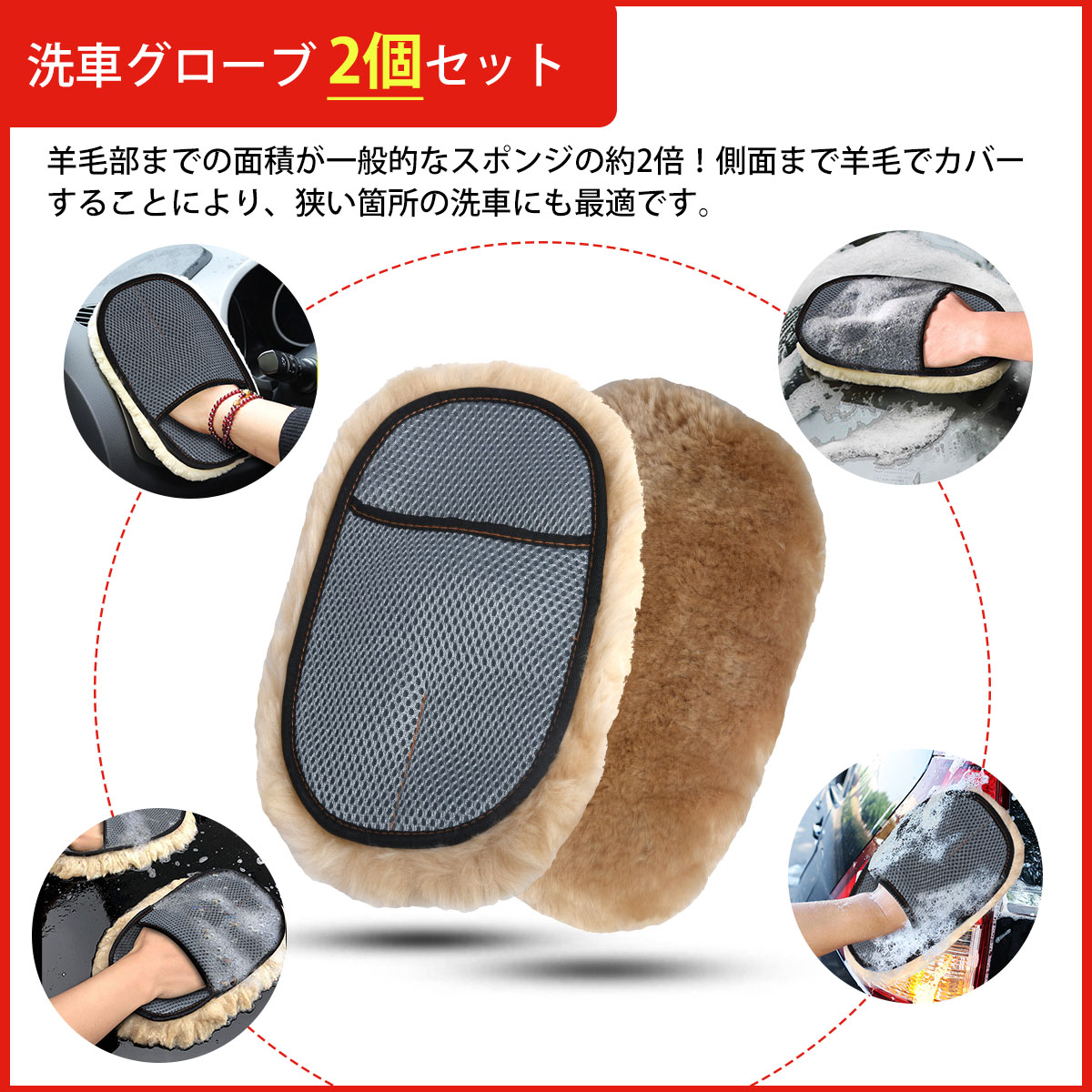 【洗車グローブ 2個セット】羊毛部までの面積が一般的なスポンジの約2倍!側面まで羊毛でカバーすることにより、狭い箇所の洗車にも最適です。