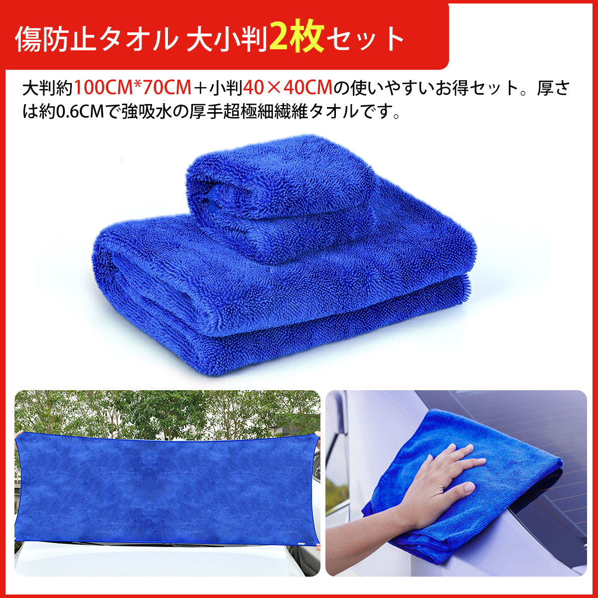 【洗車二件套:傷防止タオル 大小判2枚セット】大判約100CM*70CM+小判40×40CMの使いやすいお得セット。厚さは約0.6CMで強吸水の厚手超極細繊維タオルです。