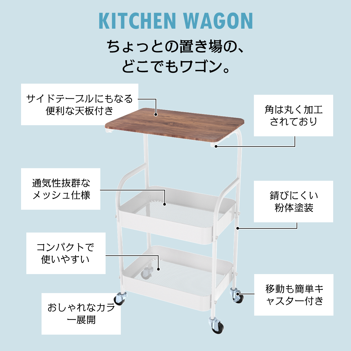 スチール部分に粉体塗装を施しているので、サビにくく、キッチンや洗面台などの水回りでも安心。