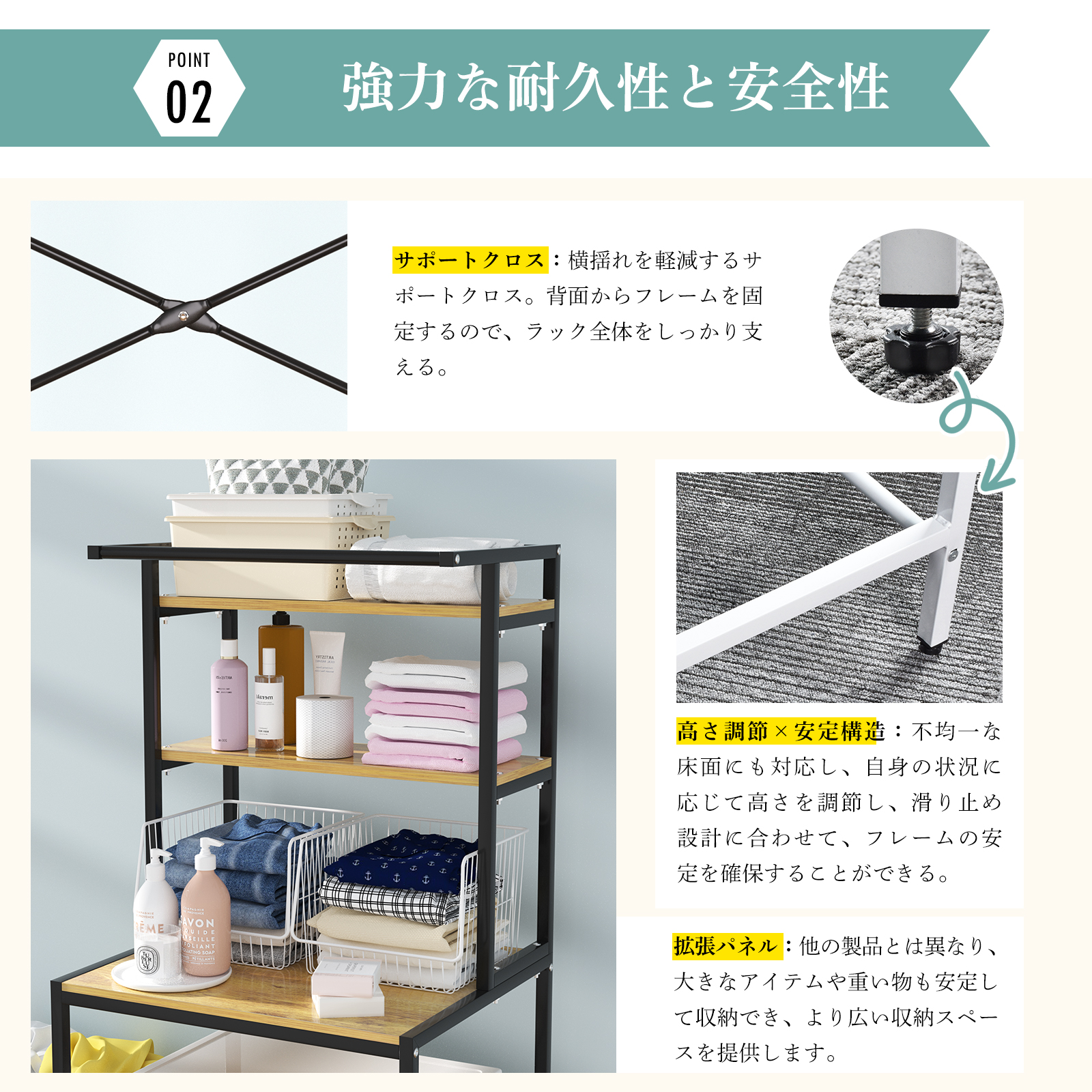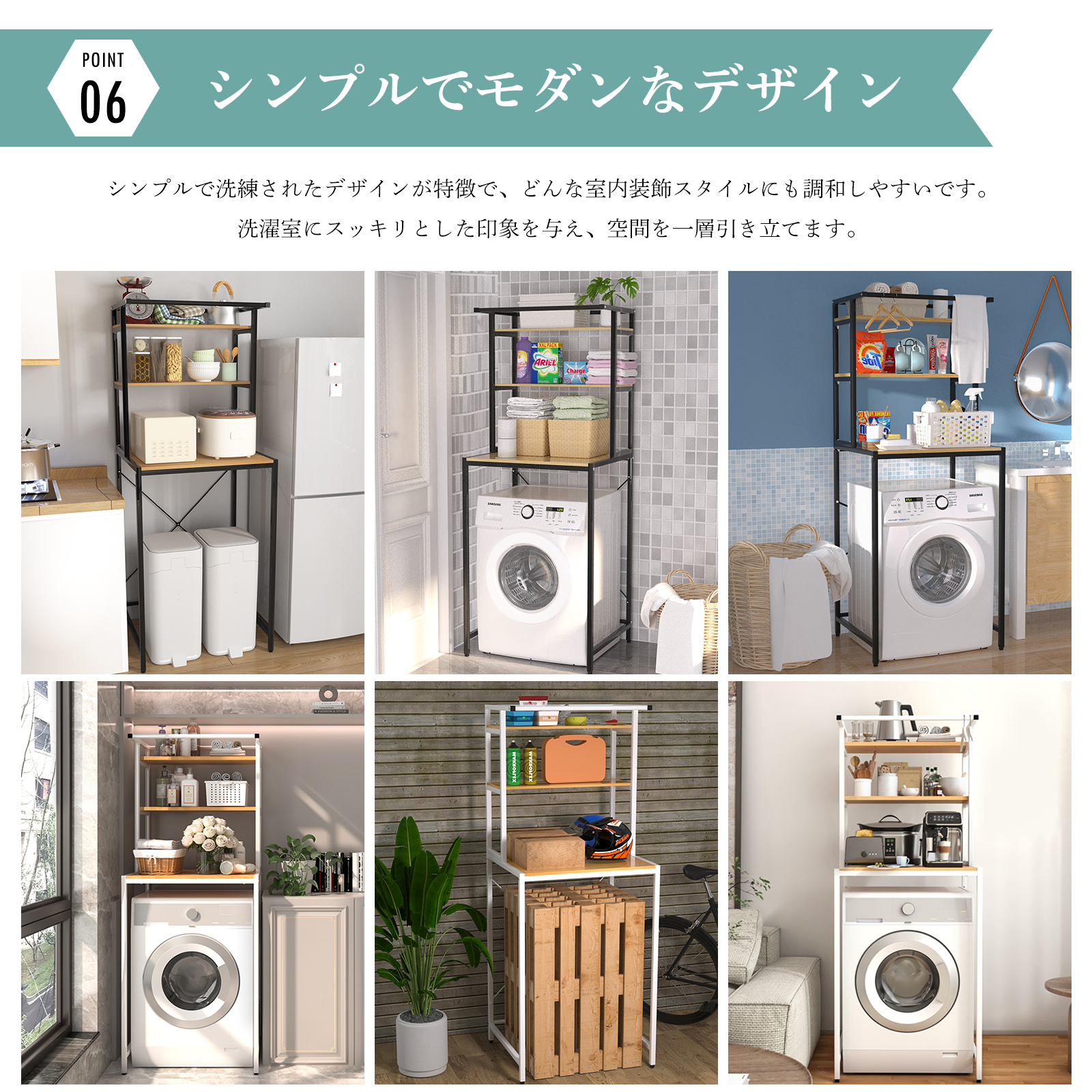 洗剤や洗濯物、タオルなどの収納にぴったりで、日常的に使うアイテムをすっきり整理できます。耐久性に優れた鉄製フレームを採用し、重い物もしっかり収納できる安全な設計。