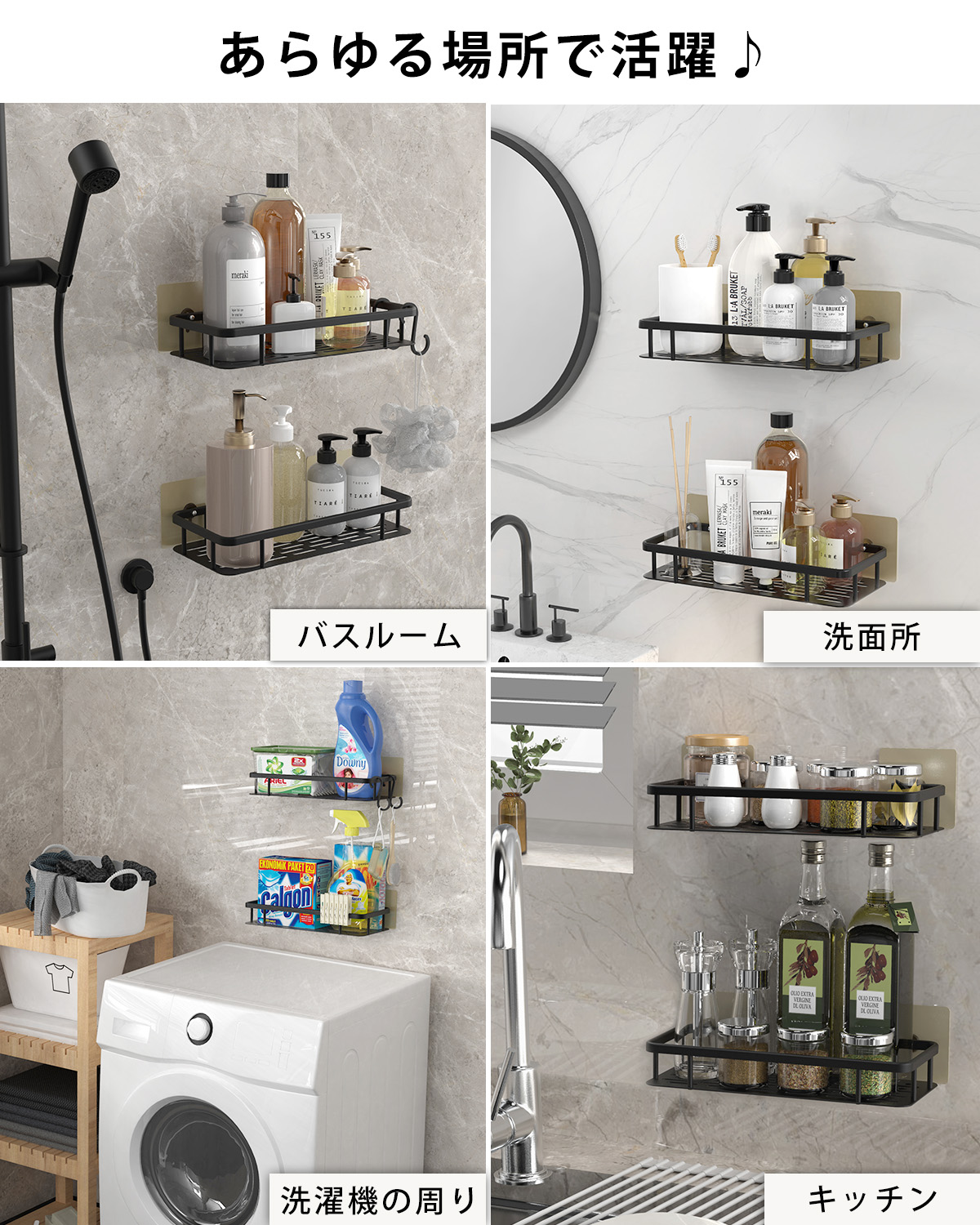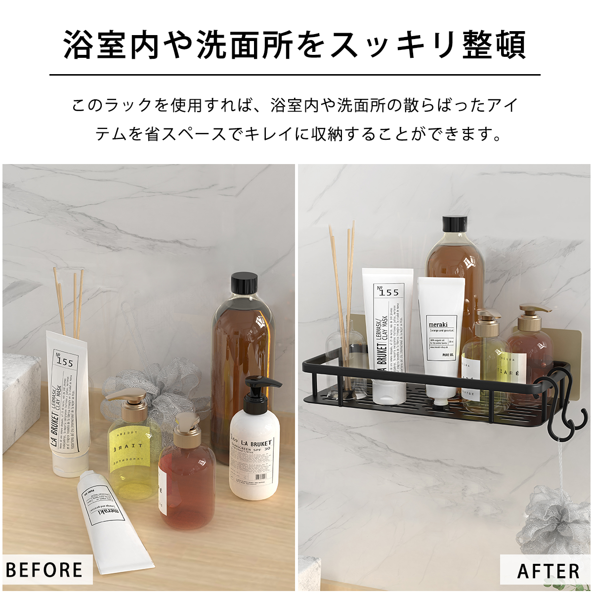 このラックを使用すれば、浴室内や洗面所の散らばったアイテムを省スペースでキレイに収納することができます。