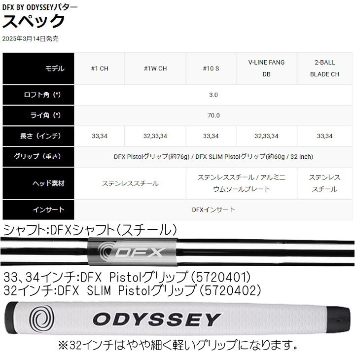 すべてにおいて、約76gのDFX Pistolグリップを装着した33、34インチのパター長さを用意しつつ、5つのうちの2つのモデルでは、より女性ゴルファーにフィットするよう、約60gで細めのDFX SLIM Pistolグリップを採用した32インチもラインアップしています。