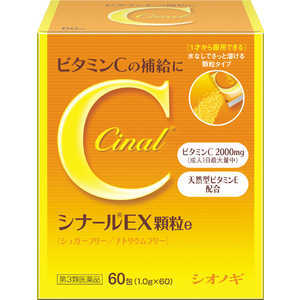 "★ 人は、体の中でビタミンCをつくることができないため、毎日摂取することが大切です★ シナールEX顆粒eは、ビタミンCの補給に適したビタミン剤口の中でさっと溶けるのみやすい顆粒です。★ ビタミンCとともに、抗酸化作用をもつ天然型ビタミンE、皮ふの正常な働きをサポートするビタミンB2を配合効能・効果 次の場合のビタミンCの補給肉体疲労時、妊娠・授乳期、病中病後の体力低下時、老年期次の諸症状の緩和しみ、そばかす、日やけ・かぶれによる色素沈着次の場合の出血予防歯ぐきからの出血、鼻出血「ただし、上記2および3の症状について、1ヵ月ほど使用しても改善がみられない場合は、医師、薬剤師、または歯科医師にご相談ください。」成分・分量 シナールEX顆粒eは、黄色の顆粒剤で、4包(1.0g*4・成人1日最大量)中に次の成分を含有しています。アスコルビン酸(ビタミンC):2000mgリボフラビン酪酸エステル(ビタミンB2誘導体):12mg酢酸d-α-トコフェロール(天然型ビタミンE):30mg添加物として含水二酸化ケイ素、ヒドロキシプロピルセルロース、粉末還元麦芽糖水アメ、アスパルテーム(L-フェニルアラニン化合物)、ショ糖脂肪酸エステル、香料、エタノール、エチルバニリン、バニリン、プロピレングリコールを含有しています。・本剤の服用により、尿が黄色くなることがありますが、これは本剤に含まれるビタミンB2が吸収利用され、その一部が尿中に排出されるためで心配ありません。・本剤の服用により、尿および大便の検査値に影響をおよぼすことがありますので、これらの検査を受ける場合は、本剤を服用していることを医師にお知らせください。用法・用量 次の量をおのみください。年齢 1回量 1日服用回数成人(15才以上) 1〜2包 2回7才以上15才未満 1包1才以上7才未満 1/2包1才未満 服用させないこと【用法・用量に関する注意】定められた用法・用量を厳守してください。小児に服用させる場合には、保護者の指導監督のもとに服用させてください。容量 60包(1.0g×60)使用上の注意 【相談すること】服用後、次の症状があらわれた場合は副作用の可能性があるので、直ちに服用を中止し、この文書を持って医師、薬剤師または登録販売者にご相談ください関係部位 症状消化器 吐き気・嘔吐、胃部不快感、胃部膨満感、食欲不振服用後、次の症状があらわれることがあるので、このような症状の持続または増強が見られた場合には、服用を中止し、この文書を持って医師、薬剤師または登録販売者にご相談ください下痢1ヵ月くらい服用しても症状がよくならない場合は服用を中止し、この文書を持って医師、歯科医師、薬剤師または登録販売者にご相談ください保管および取扱い上の注意 直射日光の当らない湿気の少ない、涼しい所に保管してください。小児の手の届かない所に保管してください。他の容器に入れ替えないでください。(誤用の原因になったり、品質が変化します)1包を分割したり残りを使用する場合には、袋の口を折り返して保管し、2日以内に使用してください。使用期限をすぎた製品は、服用しないでください。製造販売元 塩野義製薬株式会社〒541-0045大阪市中央区道修町3丁目1番8号06-6209-6948製造国 日本使用期限 使用期限が180日以上あるものをお送りします広告文責 株式会社藤井寺ケンコー薬局(072-938-6850)"