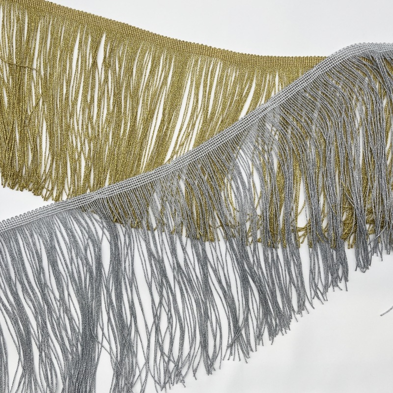 フリンジにはラメ糸が編まれておりライトの当たる舞台衣装などにお使いいただければ、キラキラと光り豪華で派手な印象になります。