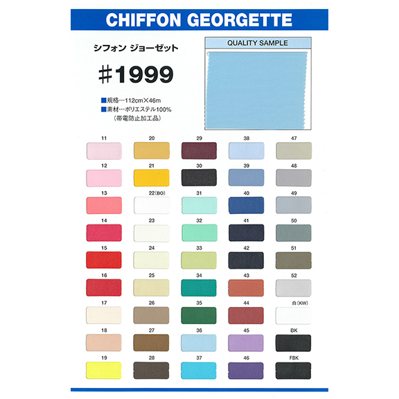 | 詳細 | 1999シフォンジョーゼットのスワッチ付き見本帳です。 ★見本帳はメール便(ネコポス)対応商品です。 □実際の商品はコチラ(クリック!) |