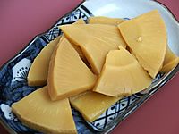 | 【予約商品 商品の出荷は12月16日以降です】 たけのこの成長の早さ、穂先の伸びる勢いの良さから縁起物とされるおせちの一品です。 大振りに切った竹の子を少し濃いめの味付けで、コリコリした食感を残しつつ柔らかく炊き上げました。 |