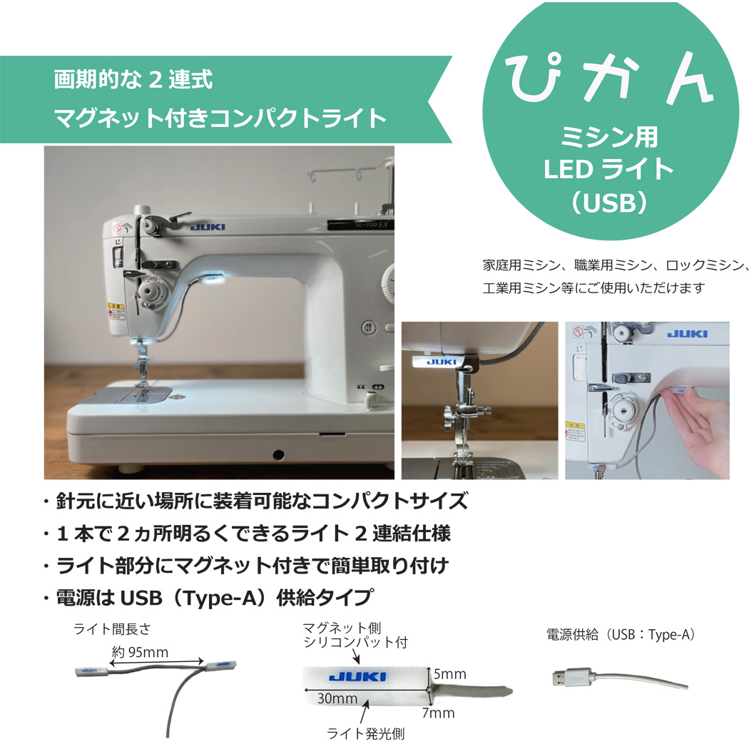 JUKI ミシン用LEDライト 「ぴかん」 アタッチメント ジューキ マグネット付 2連式 USB